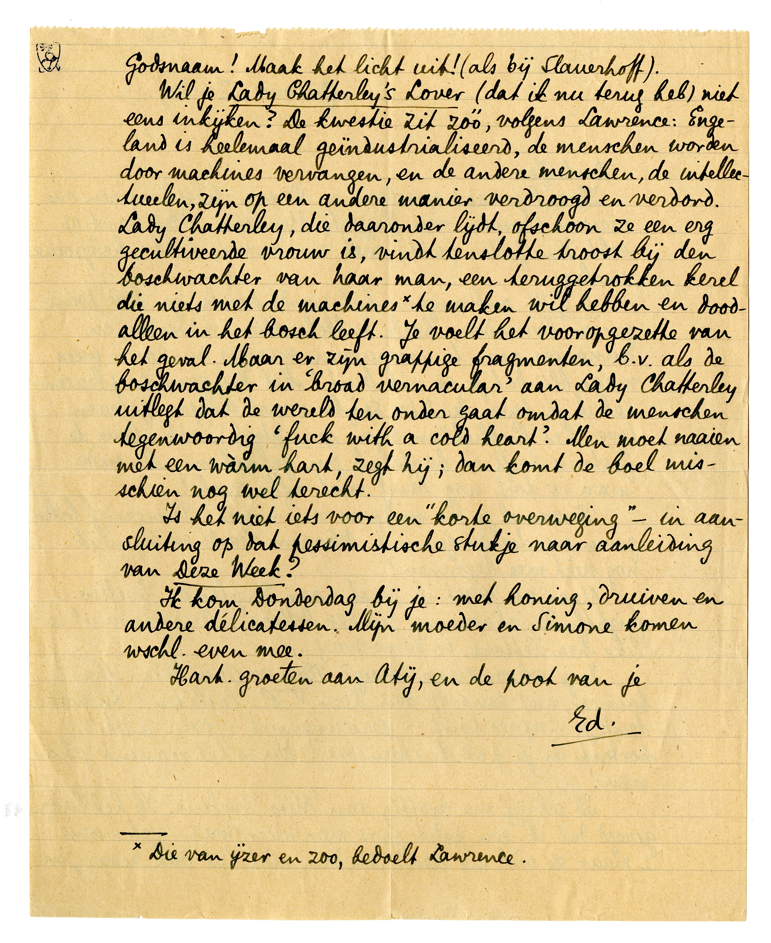 Wil je Lady Chatterley's Lover (dat ik nu terug heb) niet eens inkijken? De kwestie zit zóó, volgens Lawrence: Engeland is heelemaal geïndustrialiseerd, de menschen worden door machines vervangen, en de andere menschen, de intellectueelen, zijn op een andere manier verdroogd en verdord. Lady Chatterley, die daaronder lijdt, ofschoon ze een erg gecultiveerde vrouw is, vindt tenslotte troost bij den boschwachter van haar man, een teruggetrokken kerel die niets met de machines* te maken wil hebben en doodalleen in het bosch leeft. Je voelt het vooropgezette van het geval. Maar er zijn grappige fragmenten, b.v. als de boschwachter in ‘broad vernacular’ aan Lady Chatterley uitlegt dat de wereld ten onder gaat omdat de menschen tegenwoordig ‘fuck with a cold heart’. Men moet naaien met een wàrm hart, zegt hij; dan komt de boel misschien nog wel terecht.