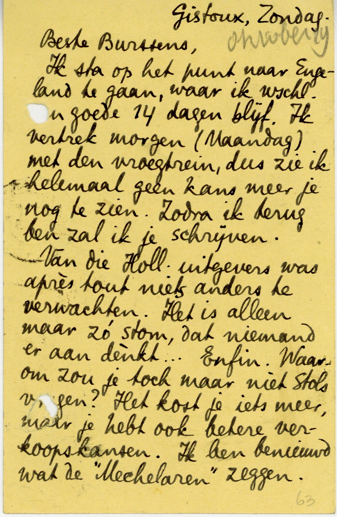 Ik sta op het punt naar Engeland te gaan, waar ik wschl. een goede 14 dagen blijf. Ik vertrek morgen (Maandag) met den vroegtrein, dus zie ik helemaal geen kans meer je nog te zien. Zodra ik terug ben zal ik je schrijven.