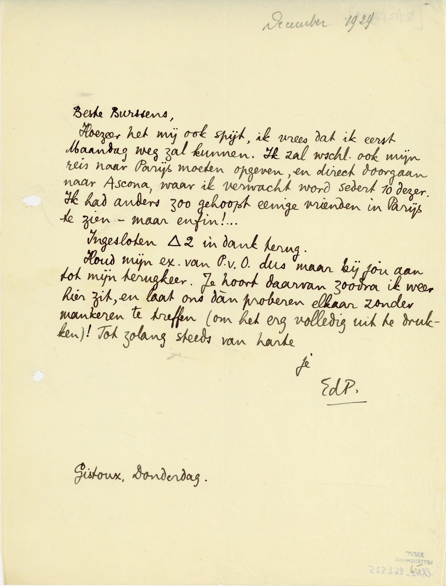 Houd mijn ex. van P.v.O. dus maar bij jou aan tot mijn terugkeer. Je hoort daarvan zoodra ik weer hier zit, en laat ons dàn proberen elkaar zonder mankeren te treffen (om het erg volledig uit te drukken)! Tot zolang steeds van harte je