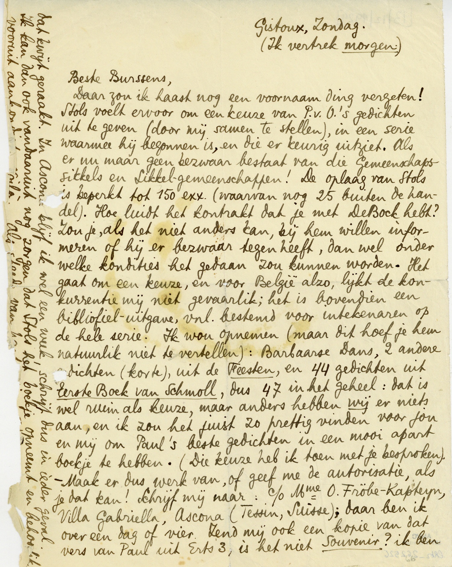 Daar zou ik haast nog een voornaam ding vergeten! Stols voelt ervoor om een keuze van P.v.O.'s gedichten uit te geven (door mij samen te stellen), in een serie waarmee hij begonnen is, en die er keurig uitziet.756 Als er nu maar geen bezwaar bestaat van die Gemeenschaps-sikkels en Sikkel-gemeenschappen! De oplaag van Stols is beperkt tot 150 exx. (waarvan nog 25 buiten de handel). Hoe luidt het kontrakt dat je met DeBock hebt? Zou je, als het niet anders kan, bij hem willen informeren of hij er bezwaar tegen heeft, dan wel onder welke kondities het gedaan zou kunnen worden. Het gaat om een keuze, en voor België alzo, lijkt de konkurrentie mij niet gevaarlik; het is bovendien een bibliofiel-uitgave, vnl. bestemd voor intekenaren op de hele serie. Ik wou opnemen (maar dit hoef je hem natuurlik niet te vertellen): Barbaarse Dans, 2 andere gedichten (korte), uit de Feesten, en 44 gedichten uit Eerste Boek van Schmoll, dus 47 in het geheel: dat is wel ruim als keuze, maar anders hebben wij er niets aan, en ik zou het juist zo prettig vinden voor jou en mij om Paul's beste gedichten in een mooi apart boekje te hebben. (Die keuze heb ik toen met je besproken). - Maak er dus werk van, of geef me de autorisatie, als je dat kan! Schrijf mij naar: c/o Mme O. Fröbe-Kapteyn, Villa Gabriella, Ascona (Tessin, Suisse); daar ben ik over een dag of vier. Zend mij ook een kopie van dat vers van Paul uit Erts 3, is het niet Souvenir? ik ben dat kwijt geraakt. In Ascona blijf ik wel een week, schrijf dus in ieder geval. Ik kan dan ook vandaaruit nog zorgen dat Stols het boekje opneemt en behoorlik vooruit aankondigt. Voilà, Als steeds van harte,