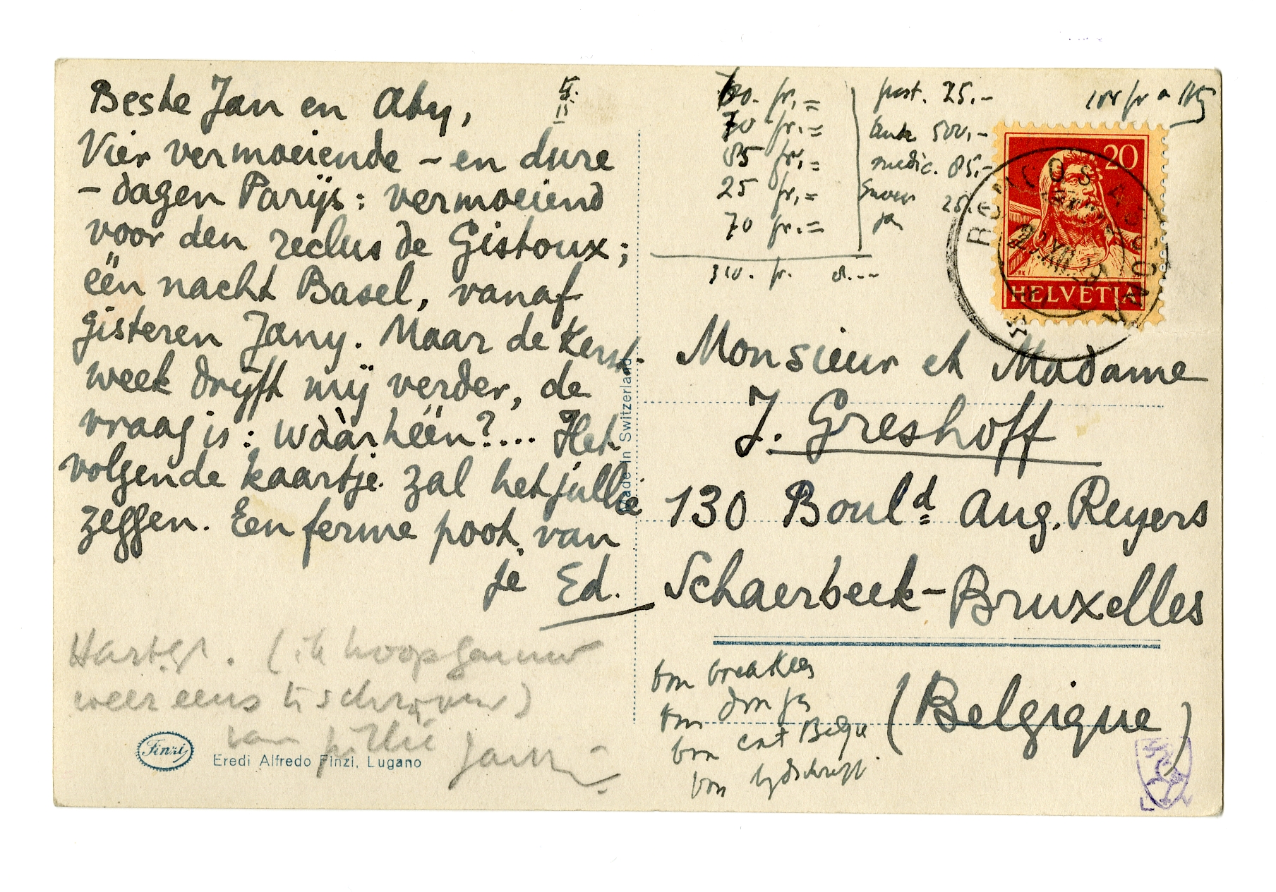 Vier vermoeiende - en dure - dagen Parijs: vermoeiend voor den reclus de Gistoux; één nacht Basel, vanaf gisteren Jany. Maar de Kerstweek drijft mij verder, de vraag is: wààrhéén?... Het volgende kaartje zal het jullie zeggen. Een ferme poot van