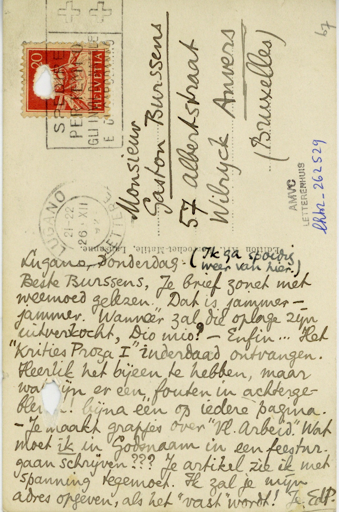 Beste Burssens, Je brief zonet met weemoed gelezen. Dat is jammer-jammer. Wannéér zal die oplage zijn uitverkocht, Dio mio? - Enfin... Het ‘Krities Proza I’ inderdaad ontvangen. Heerlik het bijeen te hebben, maar wat zijn er een fouten in achtergebleven! bijna één op iedere pagina. - Je maakt grapjes over ‘Vl. Arbeid’. Wat moet ik in Godsnaam in een feestnr. gaan schrijven???765 Je artikel766 zie ik met spanning tegemoet. Ik zal je mijn adres opgeven, als het ‘vast’ wordt!
