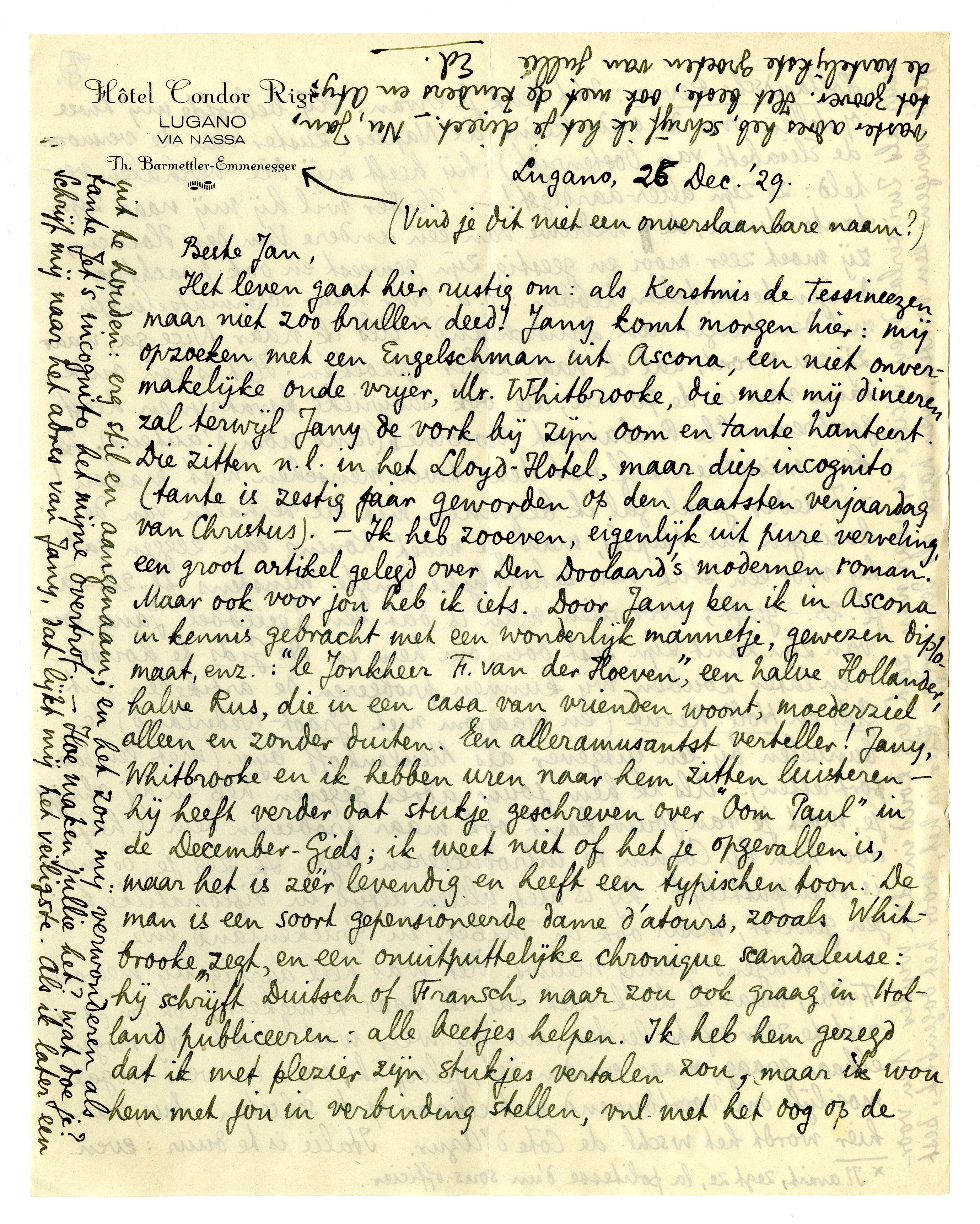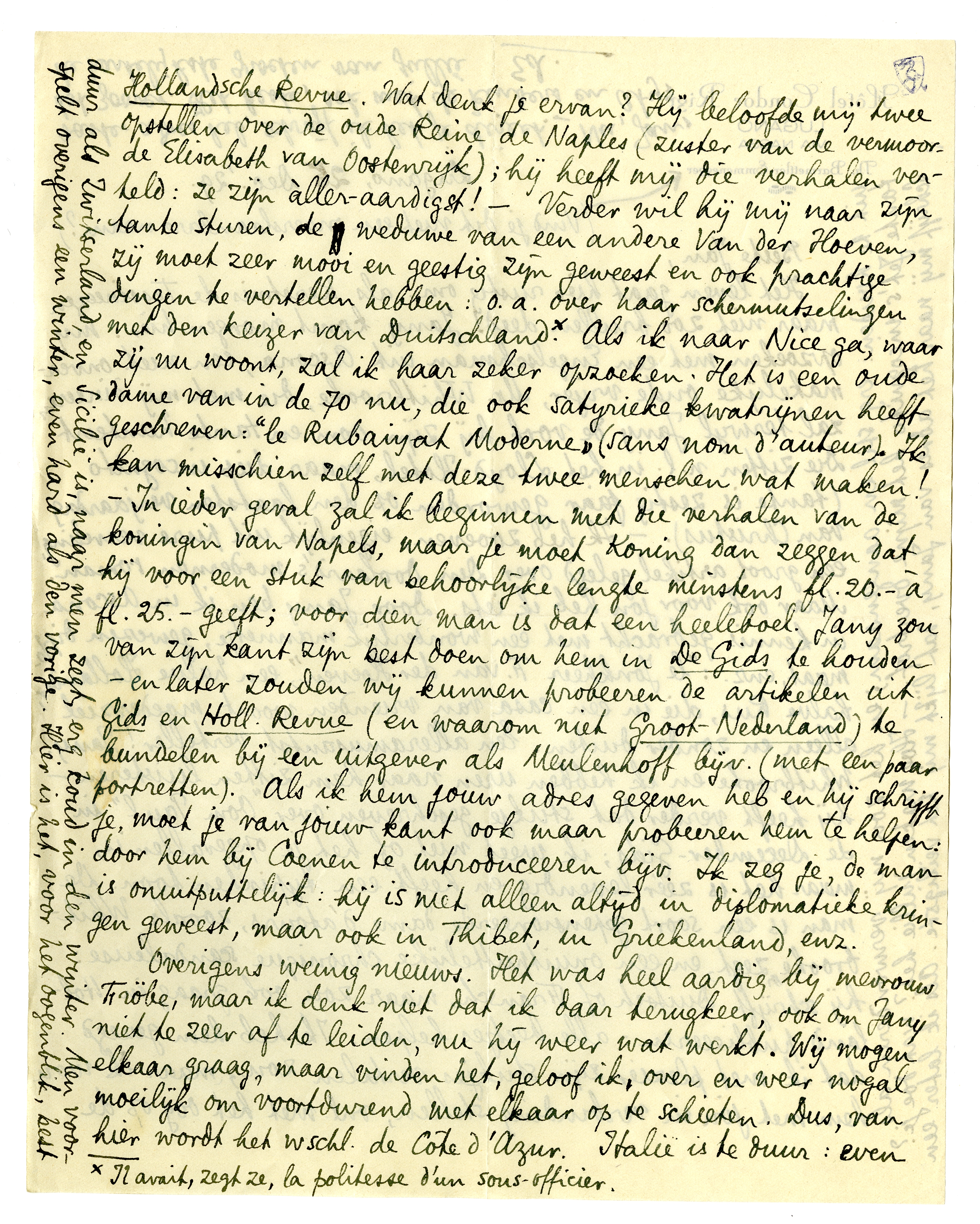 Het leven gaat hier rustig om: als Kerstmis de Tessineezen maar niet zoo brullen deed! Jany komt morgen hier: mij opzoeken met een Engelschman uit Ascona, een niet onvermakelijke oude vrijer, Mr. Whitbrooke,771 die met mij dineeren zal terwijl Jany de vork bij zijn oom en tante hanteert. Die zitten al. in het Lloyd-Hotel, maar diep incognito (tante is zestig jaar geworden op den laatsten verjaardag van Christus). - Ik heb zooeven, eigenlijk uit pure verveling, een groot artikel gelegd over Den Doolaard's modernen roman.772 Maar ook voor jou heb ik iets. Door Jany ben ik in Ascona in kennis gebracht met een wonderlijk mannetje, gewezen diplomaat, enz.: ‘le Jonkheer F. van der Hoeven’,773 een halve Hollander, halve Rus, die in een casa van vrienden woont, moederziel alleen en zonder duiten. Een alleramusantst verteller! Jany, Whitbrooke en ik hebben uren naar hem zitten luisteren - hij heeft verder dat stukje geschreven over ‘Oom Paul’774 in de December-Gids; ik weet niet of het je opgevallen is, maar het is zéér levendig en heeft een typischen toon. De man is een soort gepensioneerde dame d'atours, zooals Whitbrooke zegt, en een onuitputtelijke chronique scandaleuse: hij schrijft Duitsch of Fransch, maar zou ook graag in Holland publiceeren: alle beetjes helpen. Ik heb hem gezegd dat ik met plezier zijn stukjes vertalen zou, maar ik wou hem met jou in verbinding stellen, vnl. met het oog op de Hollandsche Revue. Wat denk je ervan? Hij beloofde mij twee opstellen over de oude Reine de Naples (zuster van de vermoorde Elisabeth van Oostenrijk); hij heeft mij die verhalen verteld: ze zijn àller-aardigst! - Verder wil hij mij naar zijn tante sturen, de weduwe van een andere Van der Hoeven, zij moet zeer mooi en geestig zijn geweest en ook prachtige dingen te vertellen hebben: o.a. over haar schermutselingen met den keizer van Duitschland.* Als ik naar Nice ga, waar zij nu woont, zal ik haar zeker opzoeken. Het is een oude dame van in de 70 nu, die ook satyrieke kwatrijnen heeft geschreven: ‘le Rubaiyat Moderne’ (sans nom d'auteur). Ik kan misschien zelf met deze twee menschen wat maken! - In ieder geval zal ik beginnen met die verhalen van de koningin van Napels, maar je moet Koning775 dan zeggen dat hij voor een stuk van behoorlijke lengte minstens fl.20,-à fl.25,-geeft; voor dien man is dat een heeleboel. Jany zou van zijn kant zijn best doen om hem in De Gids te houden - en later zouden wij kunnen probeeren de artikelen uit Gids en Holl. Revue (en waarom niet Groot-Nederland) te bundelen bij een uitgever als Meulenhoff bijv. (met een paar portretten). Als ik hem jouw adres gegeven heb en hij schrijft je, moet je van jouw kant ook maar probeeren hem te helpen: door hem bij Coenen te introduceeren bijv. Ik zeg je, de man is onuitputtelijk: hij is niet alleen altijd in diplomatieke kringen geweest, maar ook in Thibet, in Griekenland, enz.