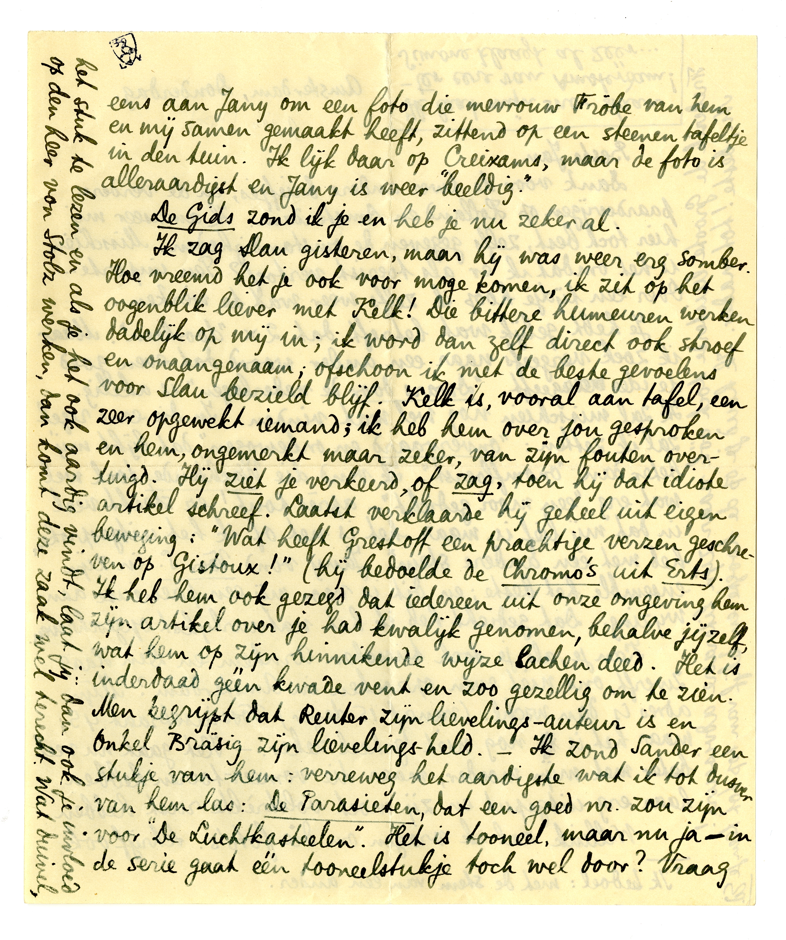Ik zag Slau gisteren, maar hij was weer erg somber. Hoe vreemd het je ook voor moge komen, ik zit op het oogenblik liever met Kelk! Die bittere humeuren werken dadelijk op mij in; ik word dan zelf ook stroef en onaangenaam; ofschoon ik met de beste gevoelens voor Slau bezield blijf. Kelk is, vooral aan tafel, een zeer opgewekt iemand; ik heb hem over jou gesproken en hem, ongemerkt maar zeker, van zijn fouten overtuigd. Hij ziet je verkeerd, of zag, toen hij dat idiote artikel812 schreef. Laatst verklaarde hij geheel uit eigen beweging: ‘Wat heeft Greshoff een prachtige verzen geschreven op Gistoux!’ (hij bedoelde de Chromo's uit Erts813). Ik heb hem ook gezegd dat iedereen uit onze omgeving hem zijn artikel over je had kwalijk genomen, behalve jijzelf, wat hem op zijn hinnikende wijze lachen deed. Het is inderdaad géén kwade vent en zoo gezellig om te zien. Men begrijpt dat Reuter zijn lievelings-auteur is en Onkel Bräsig zijn lievelings-held814. - Ik zond Sander een stukje van hem: verreweg het aardigste wat ik tot dusver van hem las: De Parasieten, dat een goed nr. zou zijn voor ‘De Luchtkasteelen’. Het is tooneel, maar nu ja - in de serie gaat één tooneelstukje toch wel door? Vraag het stuk te lezen en als je het ook aardig vindt, laat jij dan ook je invloed op den heer von Stolz werken, dan komt deze zaak wel terecht. Wat duivel, Frederik de Groote luisterde toch óók naar zijn literaire adviseurs!
