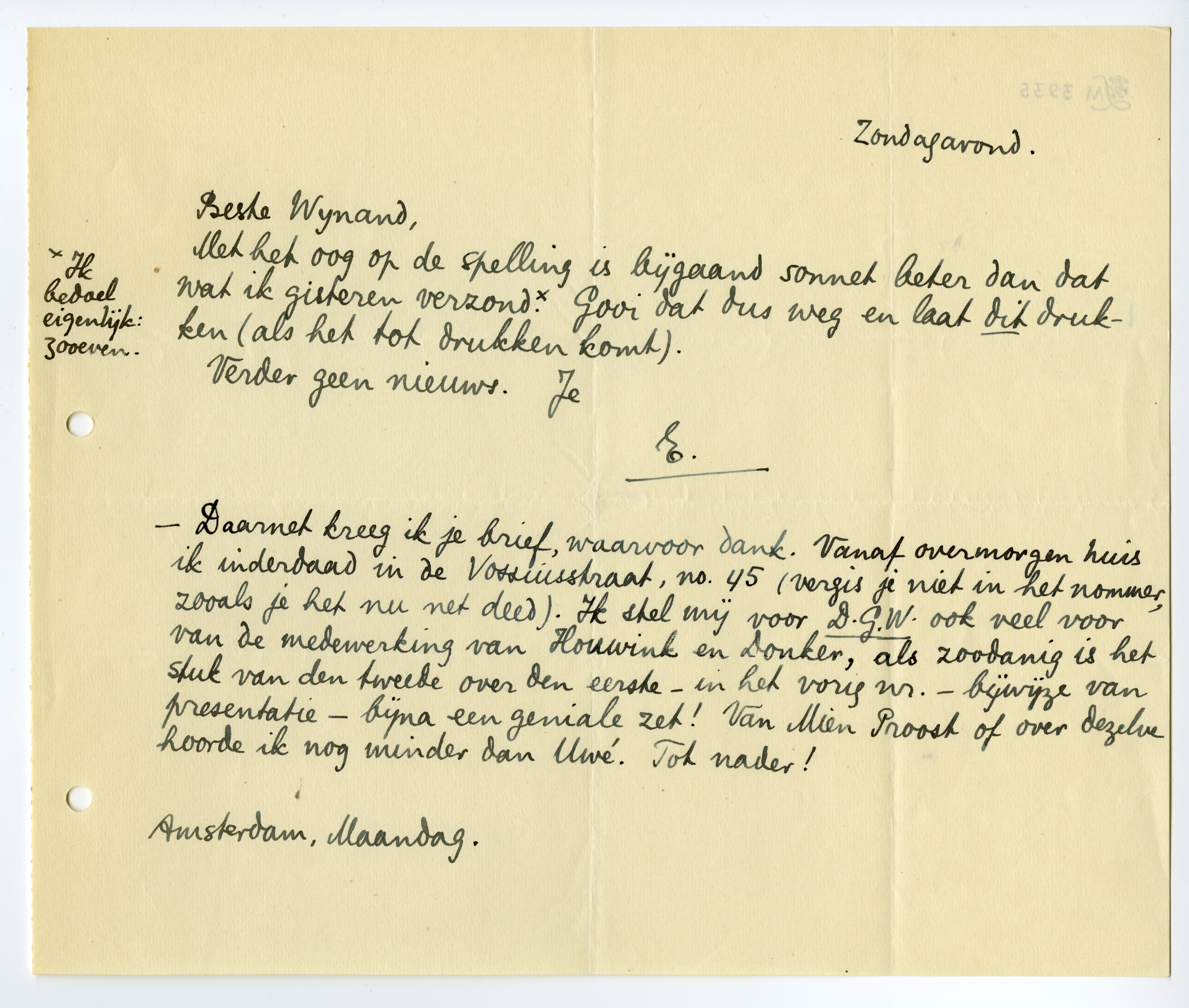 - Daarnet kreeg ik je brief, waarvoor dank. Vanaf overmorgen huis ik inderdaad in de Vossiusstraat, no. 45 (vergis je niet in het nommer, zooals je het nu net deed). Ik stel mij voor D.G.W. ook veel voor van de medewerking van Houwink en Donker818, als zoodanig is het stuk van den tweede over den eerste - in het vorig nr. - bijwijze van presentatie - bijna een geniale zet! Van Mien Proost of over dezelve hoorde ik nog minder dan Uwé. Tot nader!