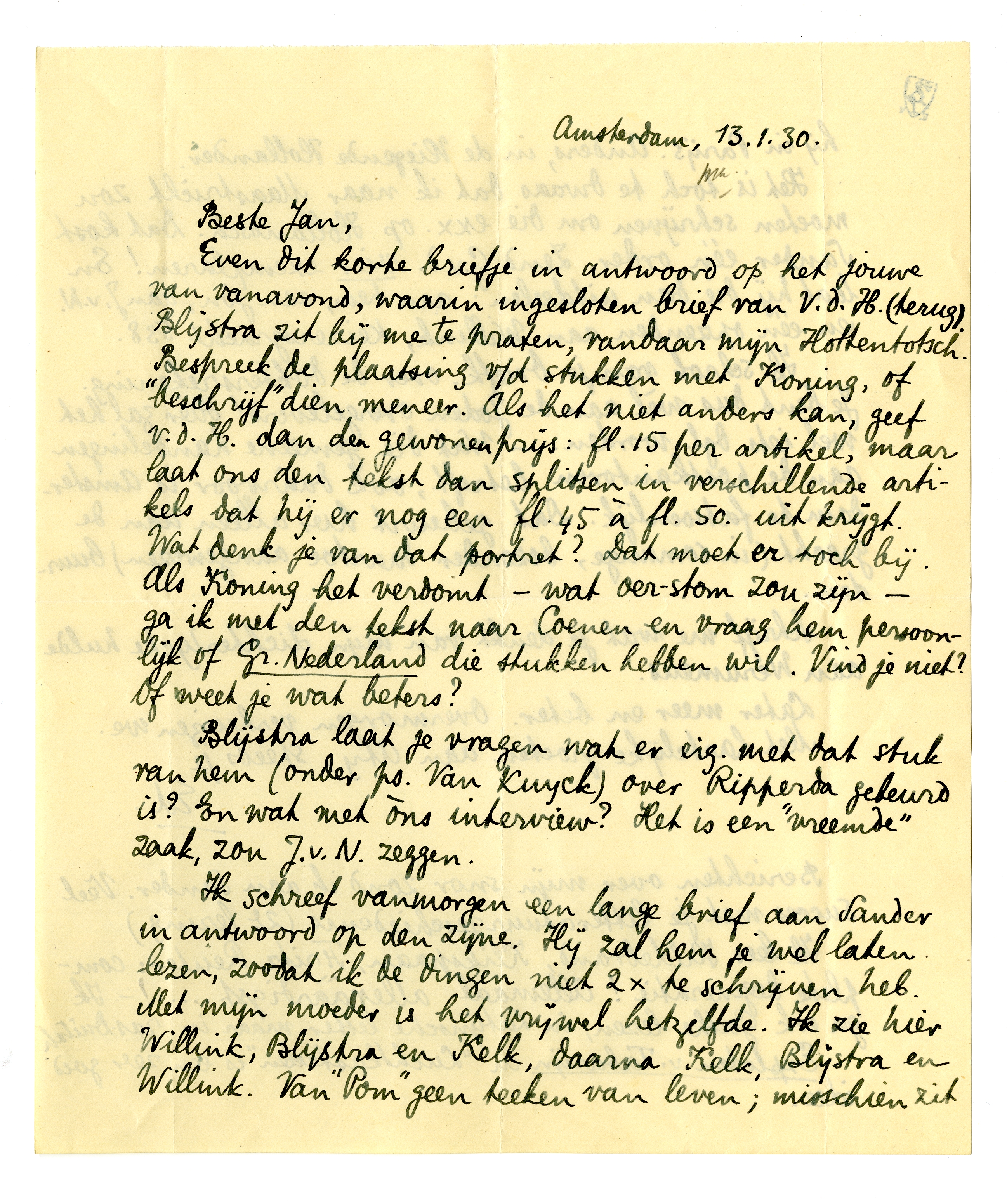 Even dit korte briefje in antwoord op het jouwe van vanavond, waarin ingesloten brief van V.d.H. (terug). Blijstra zit bij me te praten, vandaar mijn Hottentotsch. Bespreek de plaatsing v/d stukken825 met Koning, of ‘beschrijf’ dien meneer. Als het niet anders kan, geef v.d.H. dan den gewonen pijs: f. 15 per artikel, maar laat ons den tekst dan splitsen in verschillende artikels dat hij er nog een fl. 45 à fl. 50 uit krijgt. Wat denk je van dat portret? Dat moet er toch bij. Als Koning het verdomt - wat oer-stom zou zijn - ga ik met den tekst naar Coenen826 en vraag hem persoonlijk of Gr. Nederland die stukken hebben wil. Vind je niet? Of weet je wat beters?