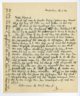 Van Jan kreeg ik een proef van zijn spijkers. In het stuk over Donkersloot verzocht ik hem zooeven per expressebrief het staartje te schrappen. Die mededeeling kwam n.l. van mij, en ik vind het onaangenaam dergelijke persoonlijke kwesties in een stuk van meer algem. strekking gemengd te zien, te meer waar dit mij in een valsch licht stelt tegenover Donker. Misschien was het een smoesje van hem ‘om mij te sparen’ en in ieder geval wordt de U.M. dus niet geraakt, maar hij. Het stuk is overigens uitstekend; het wordt door dit staartje zelfs verzwakt. Ik schreef dit alles aan Jan en verzocht hem een expressebriefk. aan de Holl. Drukkerij te zenden om dat staartje te laten vervallen. Wil jij er zoo noodig dus ook nog het jouwe toe bijdragen dat dit stuk aangehouden wordt tot het laatste moment, d.w.z. tot er een briefje van Jan verschijnt - of niet verschijnt.