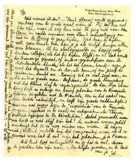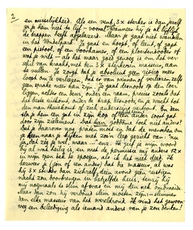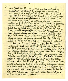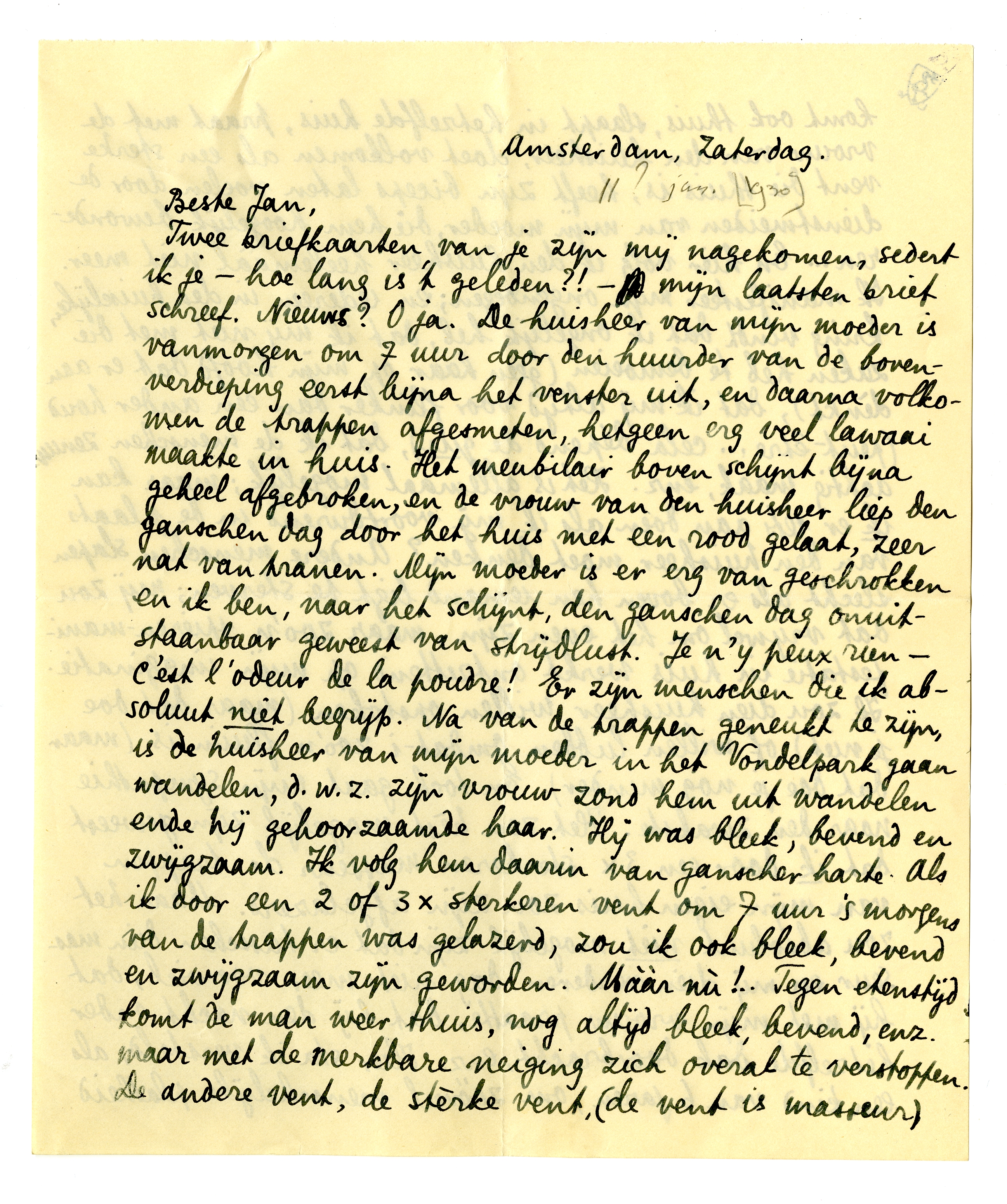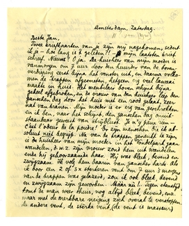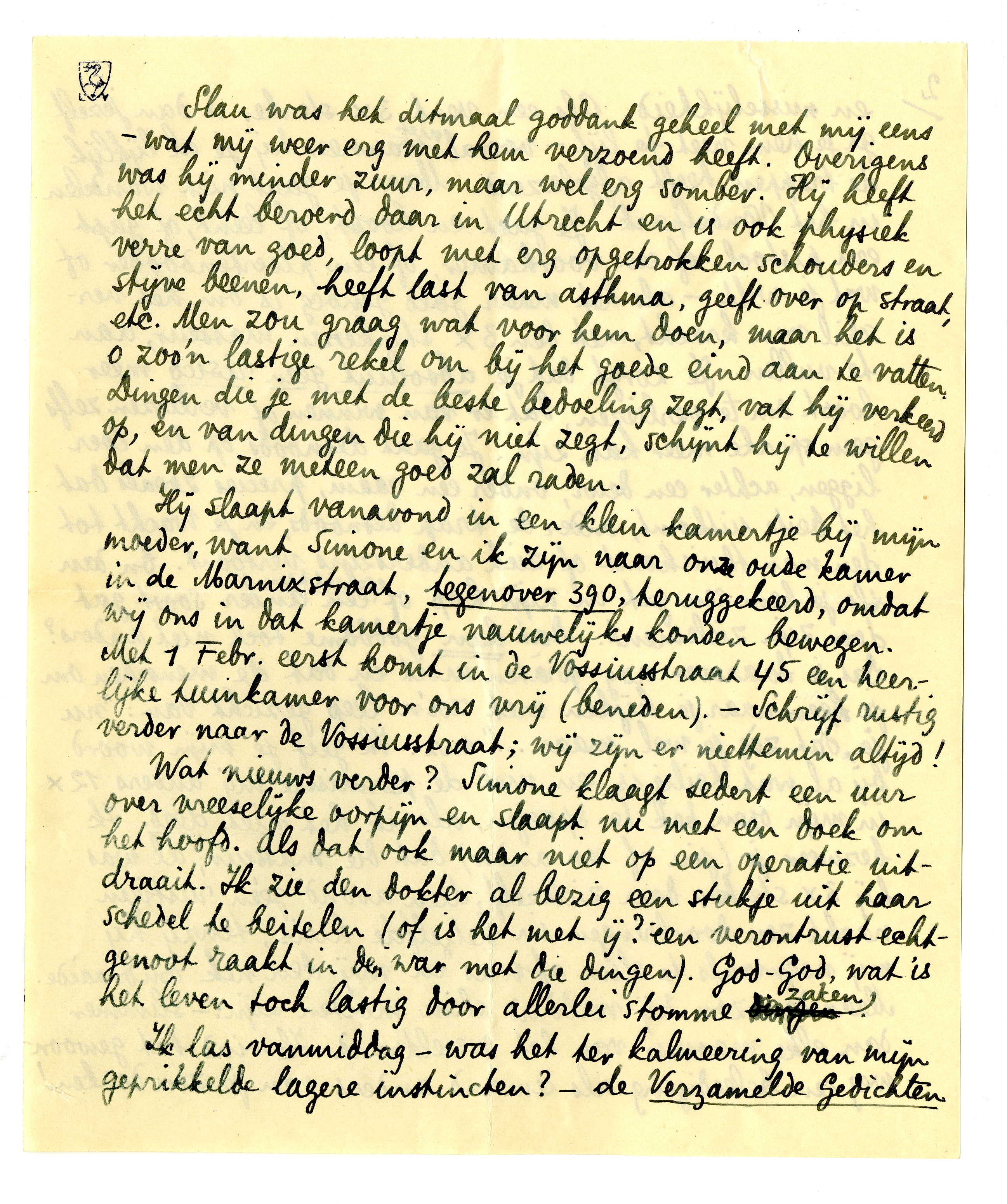 Hij slaapt vanavond in een klein kamertje bij mijn moeder, want Simone en ik zijn naar onze oude kamer in de Marnixstraat, tegenover 390, teruggekeerd, omdat wij ons in dat kamertje nauwelijks konden bewegen. Met 1 Febr. eerst komt in de Vossiusstraat 45 een heerlijke tuinkamer voor ons vrij (beneden). - Schrijf rustig verder naar de Vossiusstraat; wij zijn er niettemin altijd!