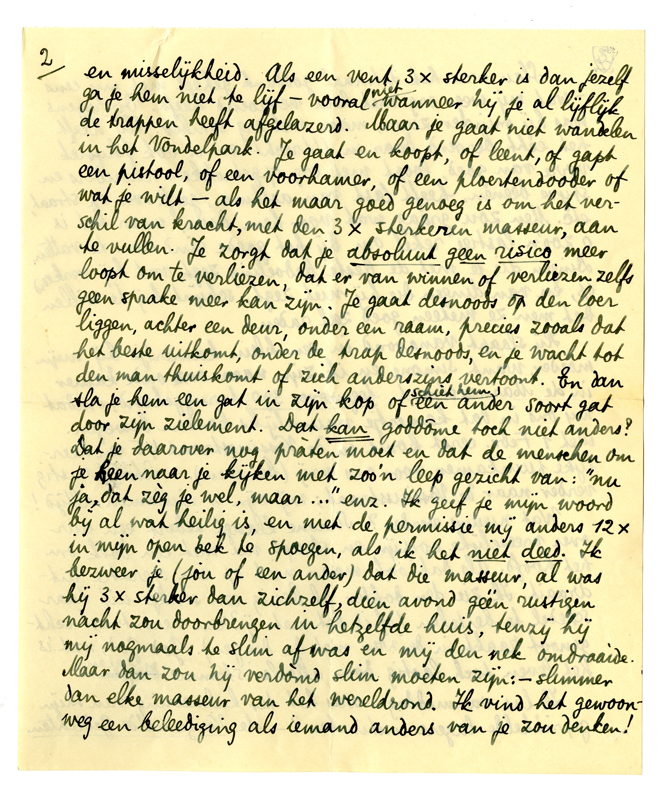 Twee briefkaarten van je zijn mij nagekomen, sedert ik je - hoe lang is 't geleden?! - mijn laatsten brief schreef. Nieuws? O ja. De huisheer van mijn moeder is vanmorgen om 7 uur door den huurder van de bovenverdieping eerst bijna het venster uit, en daarna volkomen de trappen afgesmeten, hetgeen erg veel lawaai maakte in huis. Het meubilair boven schijnt bijna geheel afgebroken, en de vrouw van den huisheer liep den ganschen dag door het huis met een rood gelaat, zeer nat van tranen. Mijn moeder is er erg van geschrokken en ik ben, naar het schijnt, den ganschen dag onuitstaanbaar geweest van strijdlust. Je n'y peux rien - c'est l'odeur de la poudre! Er zijn menschen die ik absoluut niet begrijp. Na van de trappen geneukt te zijn, is de huisheer van mijn moeder in het Vondelpark gaan wandelen, d.w.z. zijn vrouw zond hem uit wandelen ende hij gehoorzaamde haar. Hij was bleek, bevend en zwijgzaam. Ik volg hem daarin van ganscher harte. Als ik door een 2 of 3 × sterkeren vent om 7 uur 's morgens van de trappen was gelazerd, zou ik ook bleek, bevend en zwijgzaam zijn geworden. Mààr nù!.. Tegen etenstijd komt de man weer thuis, nog altijd bleek, bevend, enz. maar met de merkbare neiging zich overal te verstoppen. De andere vent, de stèrke vent, (de vent is masseur) komt ook thuis, slaapt in hetzelfde huis, praat met de vrouw van den huisheer, doet volkomen als een sterke vent die thuis is, heeft zijn biceps laten voelen door de dienstmeiden van mijn moeder, die hem hoogelijk bewonderen... En hier volg ik den huisheer heelemààl niet meer. Ik manifesteer mijn ongenoegen; en iedereen in den huiselijken kring vindt dat ik ongelijk heb, dat ik mij niet met die zaken heb te bemoeien (geen haar op mijn hoofd dat er aan dènkt), dat ik mij altijd voor flinker dan een ander houd (peut-être... cela dépend de qui), dat ik de menschen zenuwachtig maak, enz. Het is allemaal mogelijk; maar kan ik er iets aan doen als ik mij voortdurend in de plaats van den huisheer moet denken? Andere menschen slapen slecht als er boven hen iemand ligt te sterven; mij zou dat vrijwel om het even zijn, maar zoo'n spieren-manifestatie in huis werkt ontzettend op mijn imaginatie. Ik zou dien huisheer willen opstoken (maar dat doe je niet) of willen lubben omdat-i zoo'n fluim is (maar dat doe je nog minder). En toch gaat mijn sympathie naar den zwakste. Het zou bèst mogelijk zijn geweest dat ik door een 3 × sterkeren masseur de trappen van mijn eigen huis zou zijn afgelazerd. Maar het zou absoluut niet mogelijk zijn dat er tusschen dien masseur en mij dien verderen dag niets meer voorviel, dat hij met mijn vrouw praatte, dat hij den nacht onder hetzelfde dak doorbracht, enz. Hier sta ik versteld, als een kind van 6 jaren, om zóóveel menschelijke platheid en misselijkheid. Als een vent 3 × sterker is dan jezelf ga je hem niet te lijf - vooral niet wanneer hij je al lijflijk de trappen heeft afgelazerd. Maar je gaat niet wandelen in het Vondelpark. Je gaat en koopt, of leent, of gapt een pistool, of een voorhamer, of een ploertendooder of wat je wilt - als het maar goed genoeg is om het verschil van kracht, met den 3 × sterkeren masseur, aan te vullen. Je zorgt dat je absoluut geen risico meer loopt om te verliezen, dat er van winnen of verliezen zelfs geen sprake meer kan zijn. Je gaat desnoods op den loer liggen, achter een deur, onder een raam, precies zooals dat het beste uitkomt, onder de trap desnoods, en dan sla je hem een gat in zijn kop of schiet hem een ander soort gat door zijn zielement. Dat kan846 goddôme toch niet anders? Dat je daarover nog pràten moet en dat de menschen om je heen naar je kijken met zoo'n leep gezicht van: ‘nu ja, dat zèg je wel, maar...’ enz. Ik geef je mijn woord bij al wat heilig is, en met de permissie van mij anders 12 × in mijn open bek te spoegen, als ik het niet deed. Ik bezweer je (jou of een ander) dat die masseur, al was hij 3 × sterker dan zichzelf, dien avond géén rustigen nacht zou doorbrengen in hetzelfde huis, tenzij hij mij nogmaals te slim af was en mij den nek omdraaide. Maar dan zou hij verdòmd slim moeten zijn: - slimmer dan elke masseur van het wereldrond. Ik vind het ge-woonweg een beleediging als iemand anders van je zou denken!