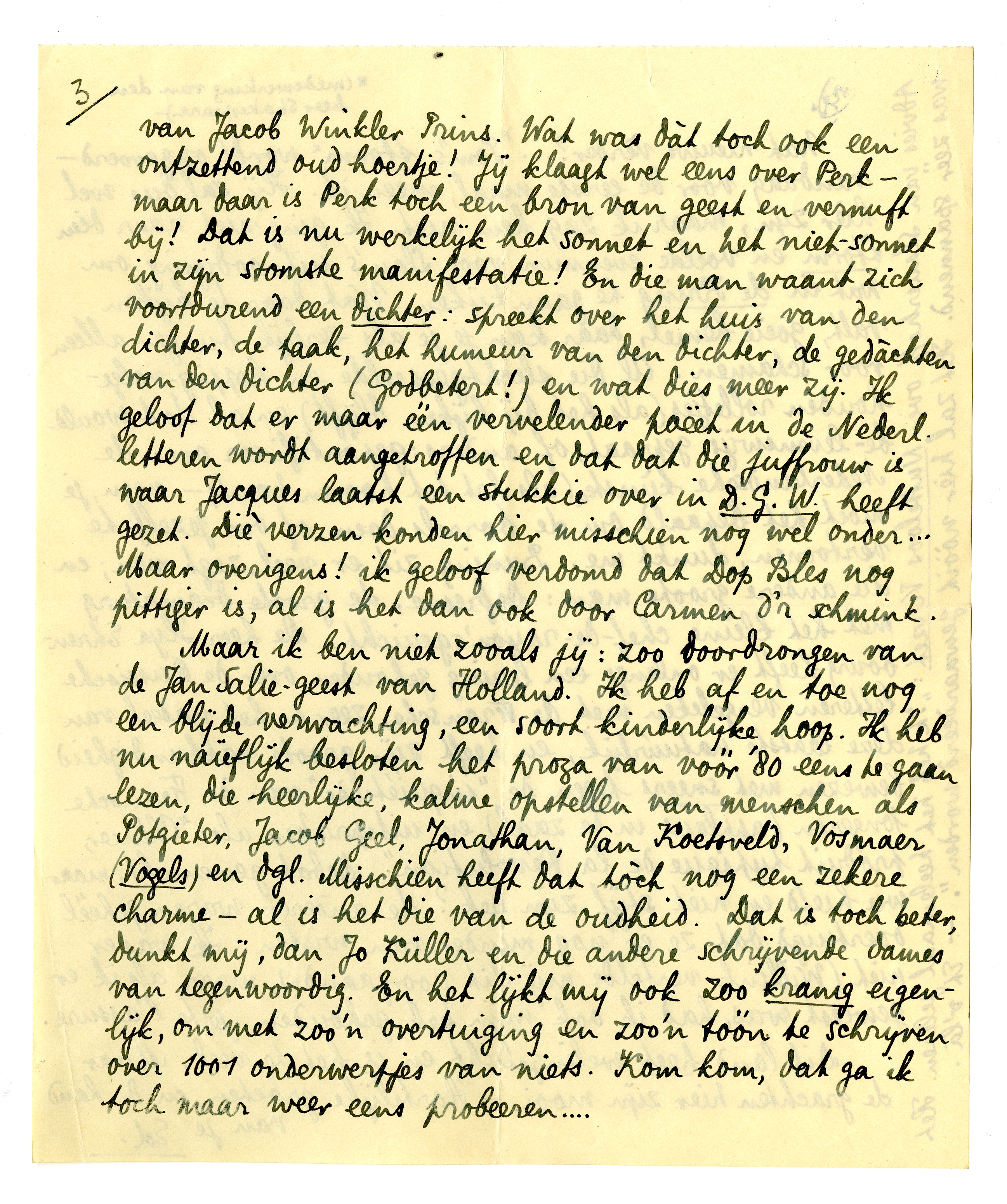 Ik las vanmiddag - was het ter kalmeering van mijn geprikkelde lagere instincten? - de Verzamelde Gedichten van Jacob Winkler Prins. Wat was dàt toch ook een ontzettend oud hoertje! Jij klaagt wel eens over Perk - maar daar is Perk toch een bron van geest en vernuft bij! Dat is nu werkelijk het sonnet en het niet-sonnet848 in zijn stomste manifestatie! En die man waant zich voortdurend een dichter: spreekt over het huis van den dichter, de taak, het humeur van den dichter, de gedàchten van den dichter (Godbetert!) en wat dies meer zij. Ik geloof dat er maar één vervelender poëet in de Nederl. letteren wordt aangetroffen en dat dat die juffrouw is waar Jacques laatst een stukkie over in D.G.W. heeft gezet849. Die verzen konden hier misschien nog wel onder... Maar overigens! ik geloof verdomd dat Dop Bles nog pittiger is, al is het dan ook door Carmen d'r schmink.