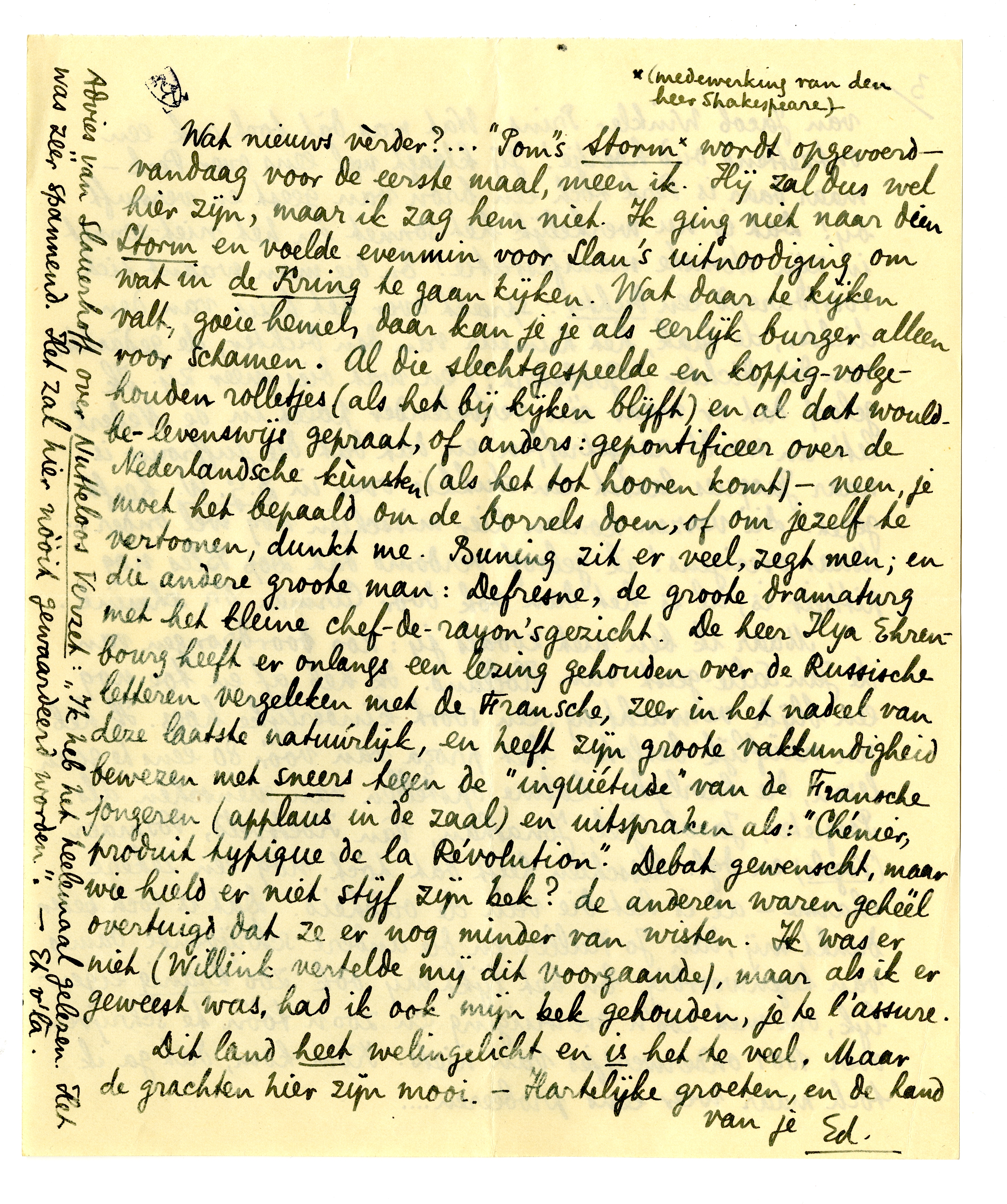 Wat nieuws vèrder?... ‘Poms’ Storm* wordt opgevoerd - vandaag voor de eerste maal, meen ik. Hij zal dus wel hier zijn, maar ik zag hem niet. Ik ging niet naar dien Storm en voelde evenmin voor Slau's uitnoodiging om wat in de Kring te gaan kijken. Wat daar te kijken valt, goeie hemel, daar kan je je als eerlijk burger alleen voor schamen. Al die slechtgespeelde en koppig-volgehouden rolletjes (als het bij kijken blijft) en al dat would-be-levenswijs gepraat, of anders: gepontificeer over de Nederlandsche kùnsten (als het tot hooren komt) - neen, je moet het bepaald om de borrels doen, of om jezelf te vertoonen, dunkt me. Buning zit er veel, zegt men; en die andere groote man: Defresne, de groote dramaturg met het kleine chef-de-rayon's gezicht. De heer Ilya Ehrenbourg heeft er onlangs een lezing gehouden over de Russische letteren vergeleken met de Fransche, zeer in het nadeel van deze laatste natuúrlijk, en heeft zijn groote vakkundigheid bewezen met sneers tegen de ‘inquiétude’ van de Fransche jongeren (applaus in de zaal) en uitspraken als: ‘Chénier, produit typique de la Révolution’. Debat gewenscht, maar wie hield er niet stijf zijn bek? de anderen waren gehéél overtuigd dat ze er nog minder van wisten. Ik was er niet (Willink vertelde mij dit voorgaande), maar als ik er geweest was, had ik ook mijn bek gehouden, je te l'assure.