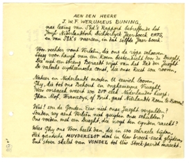 In Amsterdam schreef ik nog een sonnet voor Buning, die na in Erts Vondel gepasticheerd te hebben, in De Telegraaf geklaagd heeft en de jongelui, bij wie de Fransche en Duitsche invloeden weer zoo merkbaar waren, voor de zooveelste maal naar de Gouden Eeuw, en Vondel in top, verwezen.