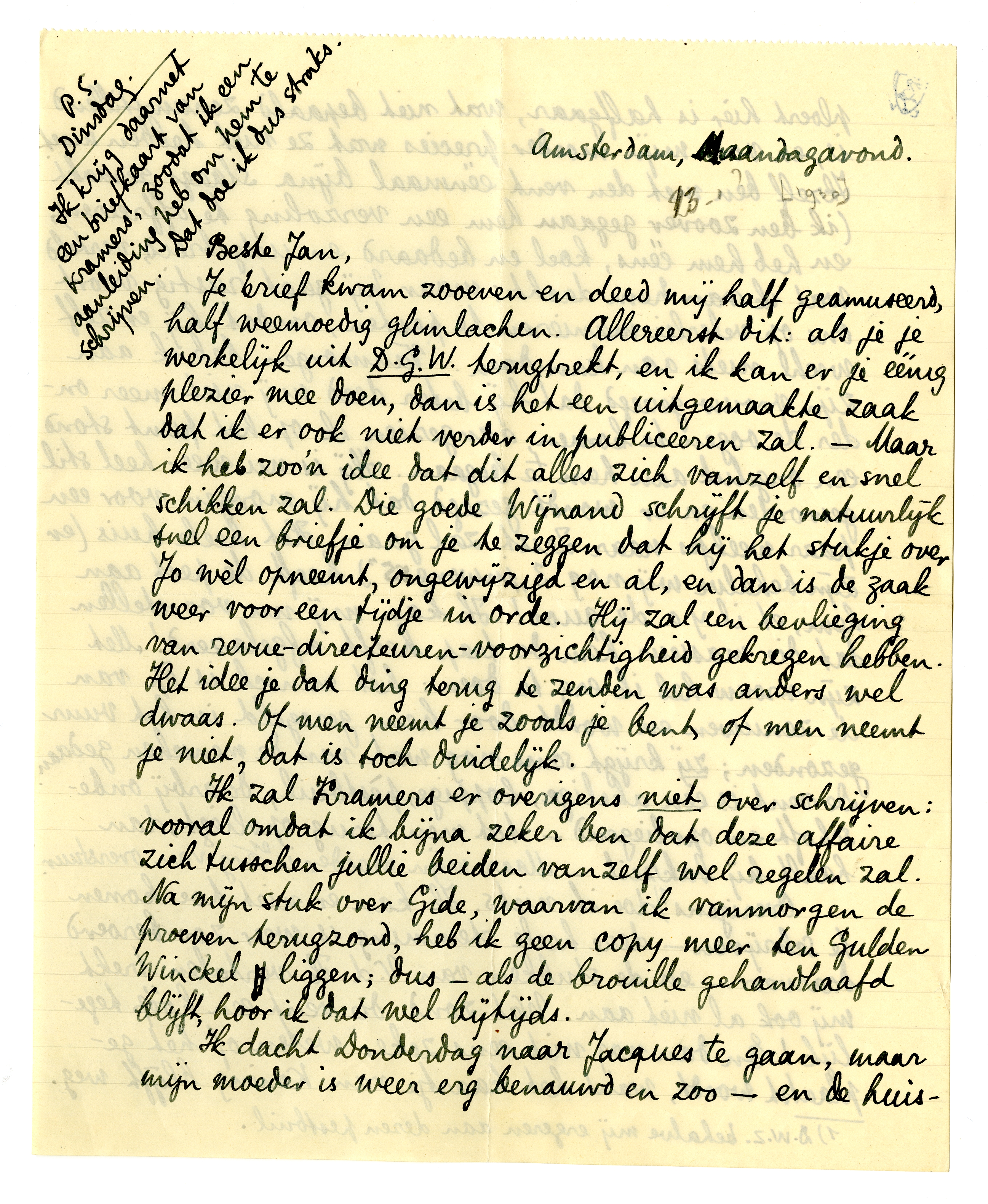 Ik zal Kramers er overigens niet over schrijven: vooral omdat ik bijna zeker ben dat deze affaire zich tusschen jullie beiden vanzelf wel regelen zal. Na mijn stuk over Gide853, waarvan ik vanmorgen de proeven terugzond, heb ik geen copy meer ten Gulden Winckel liggen; dus - als de brouille gehandhaafd blijft, hoor ik dat wel bijtijds.