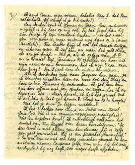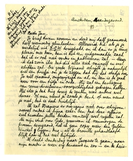 Als ik Donderdag niet naar Jacques kan gaan, ga ik Woensdag misschien heen en weer tot Den Haag en hoop er dan Kramers te ontmoeten. Ik zal hem dan over deze affaire met jou spreken en zeggen hoe ik er tegenover sta. - Maar heusch, ik heb het gevoel dat ik ook dàn te laat zal komen. (Houd me op de hoogte.)
