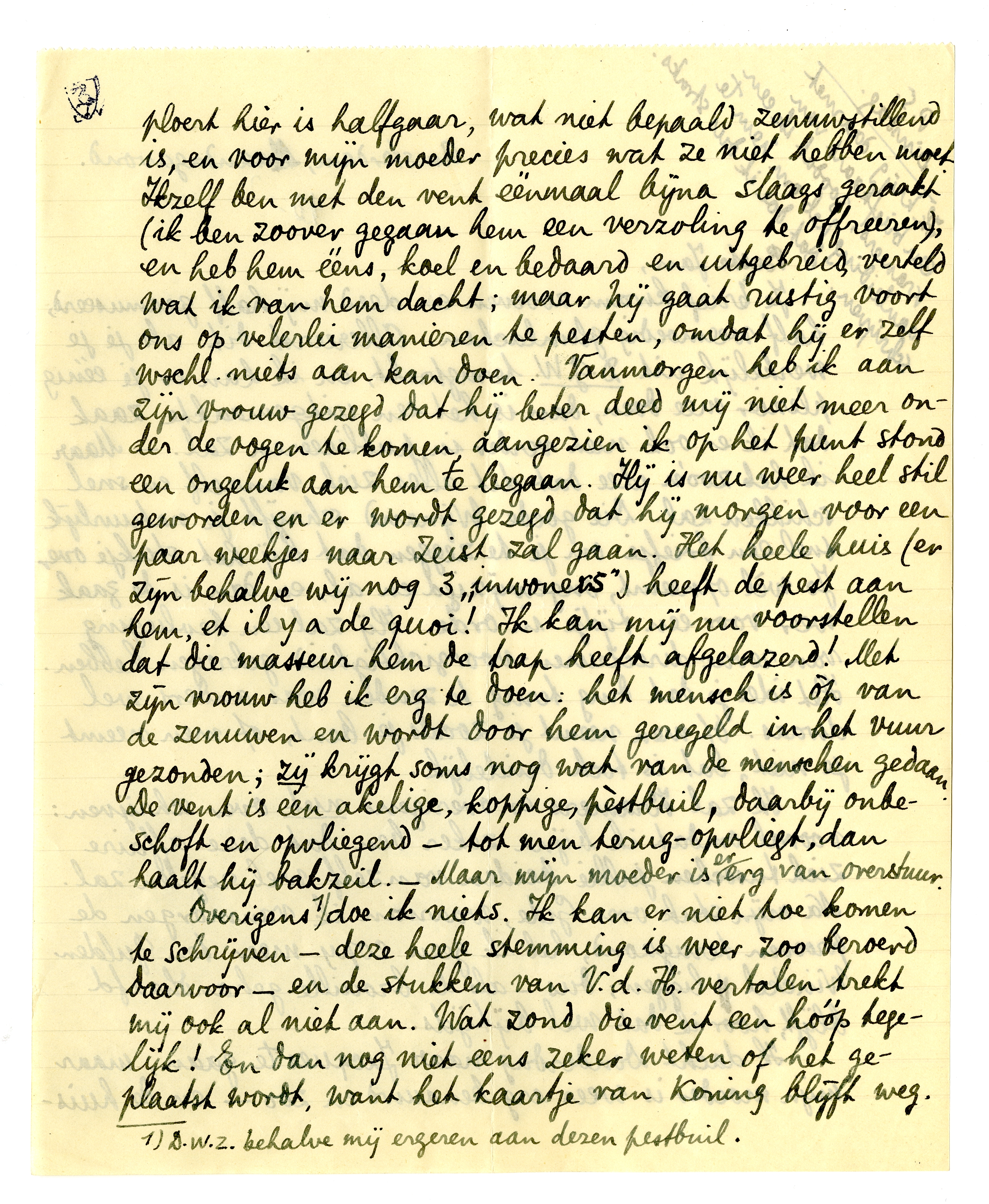 Ik dacht Donderdag naar Jacques te gaan, maar mijn moeder is weer erg benauwd en zoo - en de huisploert hier is halfgaar, wat niet bepaald zenuwstillend is, en voor mijn moeder precies wat ze niet hebben moet. Ikzelf ben met den vent éénmaal bijna slaags geraakt (ik ben zoover gegaan hem een verzoling te offreeren), en heb hem ééns, koel en bedaard en uitgebreid, verteld wat ik van hem dacht; maar hij gaat rustig voort ons op velerlei manieren te pesten, omdat hij er zelf wschl. niets aan kan doen. Vanmorgen heb ik aan zijn vrouw gezegd dat hij beter deed mij niet meer onder oogen te komen, aangezien ik op het punt stond een ongeluk aan hem te begaan. Hij is nu weer heel stil geworden en er wordt gezegd dat hij morgen voor een paar weekjes naar Zeist zal gaan. Het heele huis (er zijn behalve wij nog 3 ‘inwoners’) heeft de pest aan hem, et il? a de quoi! Ik kan mij nu voorstellen dat die masseur hem de trap heeft afgelazerd! Met zijn vrouw heb ik erg te doen: het mensch is òp van de zenuwen en wordt door hem geregeld in het vuur gezonden; zij krijgt soms nog wat van de menschen gedaan. De vent is een akelige, koppige, pèstbuil, daarbij onbeschoft en opvliegend - tot men te-rug-opvliegt, dan haalt hij bakzeil. - Maar mijn moeder is er erg van overstuur.