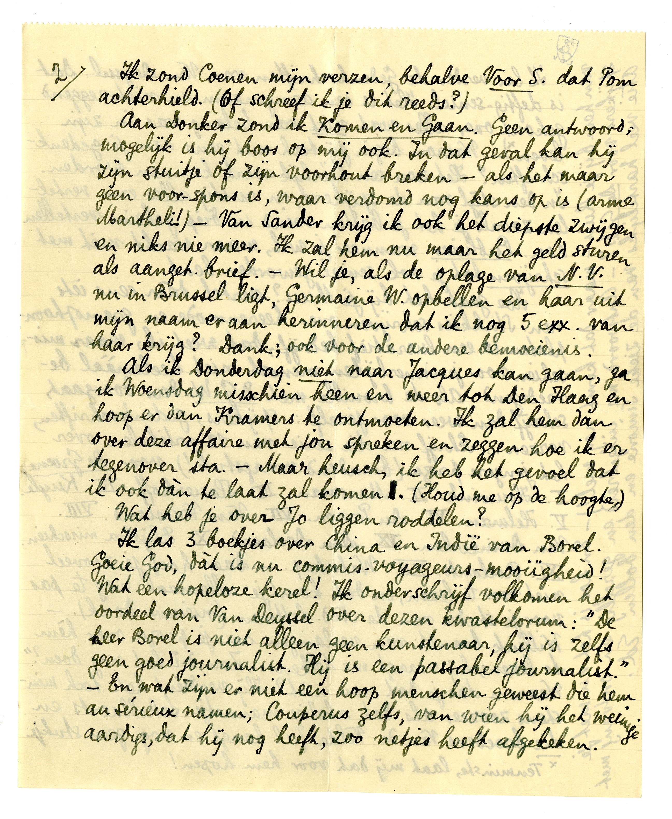 Aan Donker zond ik Komen en Gaan. Geen antwoord; mogelijk is hij boos op mij ook. In dat geval kan hij zijn stuitje of zijn voorhout breken - als het maar geen voor-spons is, waar verdomd nog kans op is (arme Martheli!) - Van Sander krijg ik ook het diepste zwijgen en niks nie meer. Ik zal hem nu maar het geld sturen als aanget. brief - Wil je, als de oplage van N.V. nu in Brussel ligt, Germaine W. opbellen en haar uit mijn naam er aan herinneren dat ik nog 5 exx. van haar krijg? Dank; ook voor de andere bemoeienis.