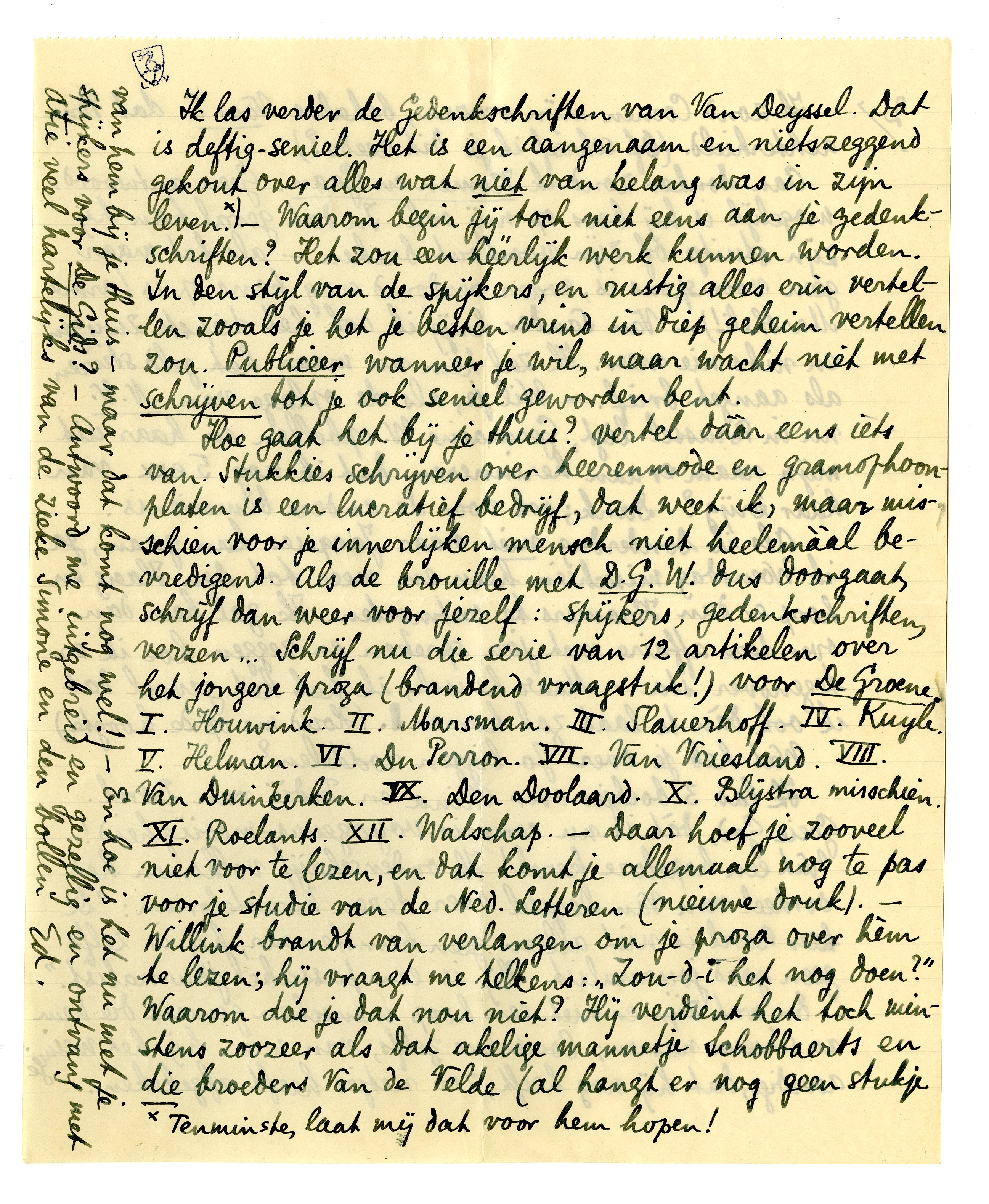 Je brief kwam zooeven en deed mij half geamuseerd, half weemoedig glimlachen. Allereerst dit: als je je werkelijk uit D.G.W. terugtrekt, en ik kan er je éénig plezier mee doen, dan is het een uitgemaakte zaak dat ik er ook niet verder in publiceeren zal. - Maar ik heb zoo'n idee dat dit alles zich vanzelf en snel schikken zal. Die goede Wijnand schrijft je natuurlijk snel een briefje om te zeggen dat hij het stukje over Jo852 wèl opneemt, ongewijzigd en al, en dan is de zaak weer voor een tijdje in orde. Hij zal een bevlieging van revue-directeuren-voorzichtigheid gekregen hebben. Het idee je dat ding terug te zenden was anders wel dwaas. Of men neemt je zooals je bent, of men neemt je niet, dat is toch duidelijk.