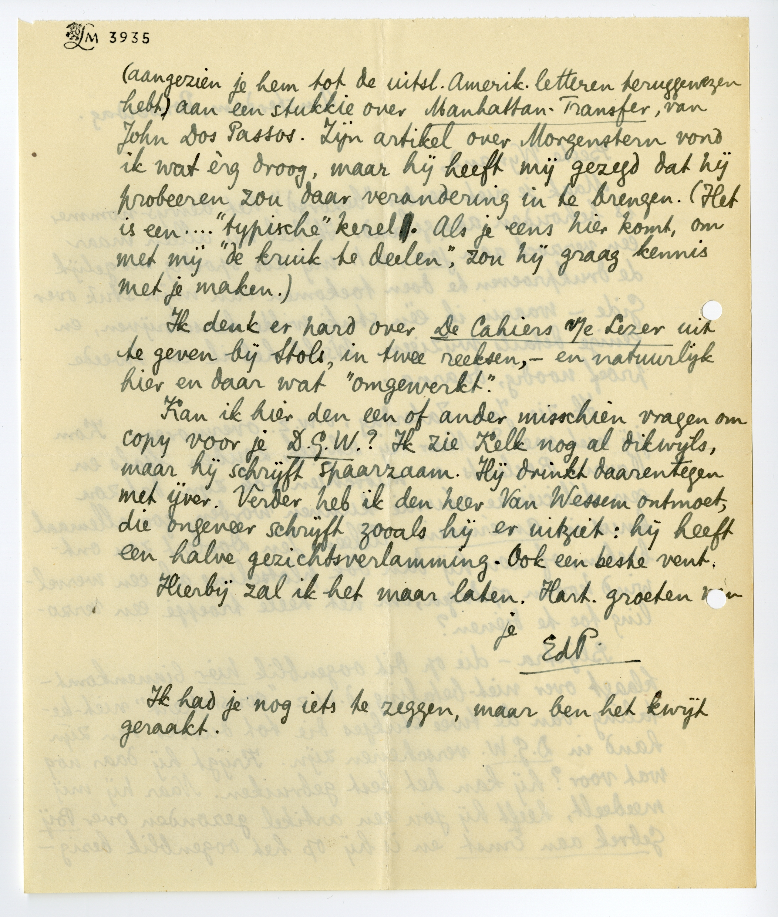 Ik denk er hard over De Cahiers v/e Lezer uit te geven bij Stols, in twee reeksen, - en natuurlijk hier en daar wat ‘omgewerkt’.