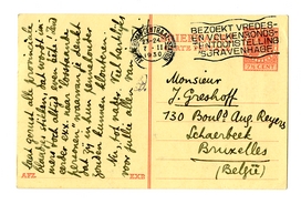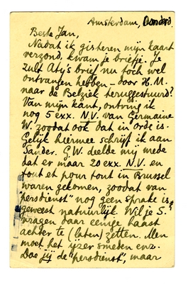Nadat ik gisteren mijn kaart verzond, kwam je briefje. Je zult Aty's brief nu toch wel ontvangen hebben - door H.M. naar de Belziek teruggestuurd? Van mijn kant, ontving ik nog 5 exx. N.V. van Germaine W. zoodat ook dat in orde is. Gelijk hiermee schrijf ik aan Sander. G.W. deelde mij mede dat er maar 20 exx. N.V. en tout et pour tout in Brussel waren gekomen, zoodat van ‘persdienst’ nog geen sprake is geweest natuurlijk. Wil je S. vragen daar eenige haast achter te (laten) zetten. Men moet het ijzer smeden enz. Doe jij de ‘persdienst’, maar laat gerust alle provinciale blaadjes stikken, dat wordt immers toch altijd even bête! Zend eerder exx. naar ‘losstaande personen’ waarvan je denkt dat zij in hun pennehouder zouden kunnen klouteren.