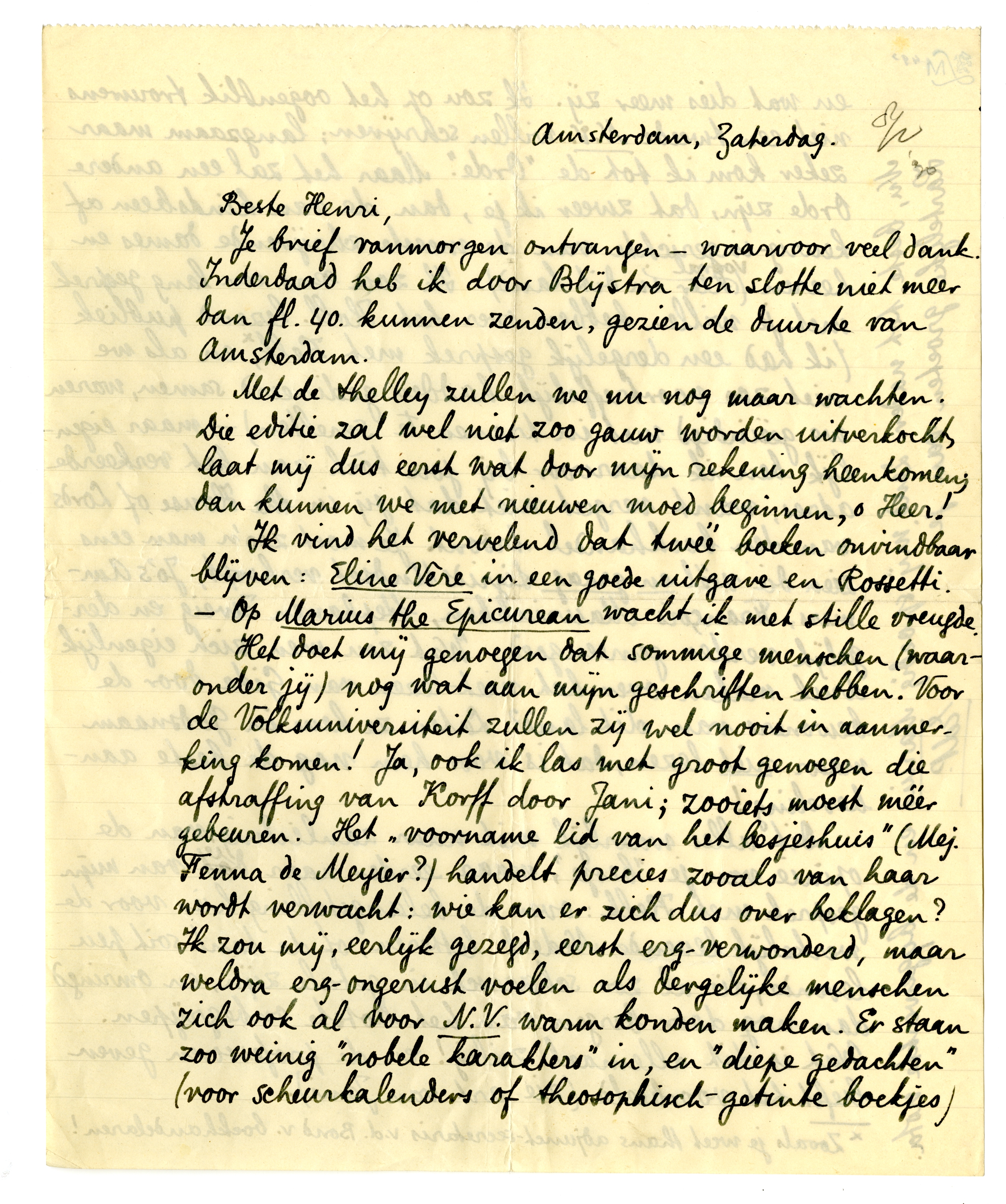 Ik vind het vervelend dat twéé boeken onvindbaar blijven: Eline Vere in een goede uitgave en Rossetti. - Op Marius the Epicurean wacht ik met stille vreugde.