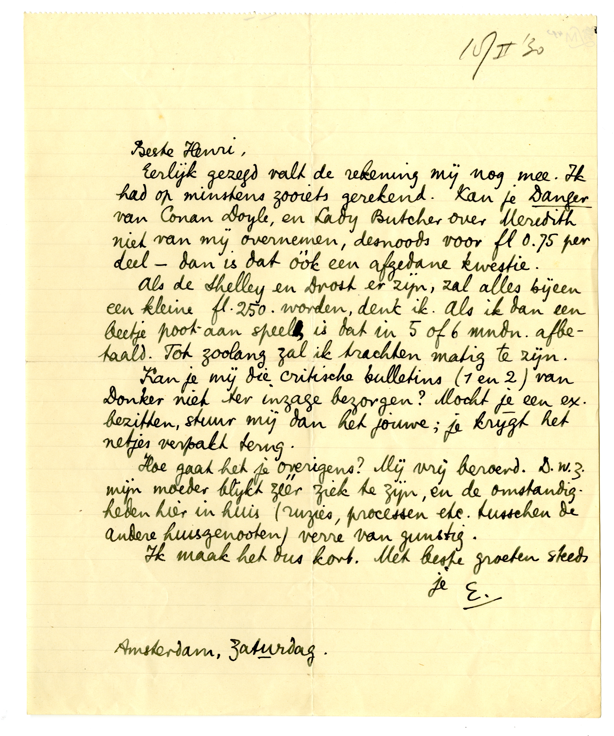 Hoe gaat het je overigens? Mij vrij beroerd. D.w.z. mijn moeder blijkt zéér ziek te zijn, en de omstandigheden hier in huis (ruzies, processen etc. tusschen de andere huisgenooten) verre van gunstig.