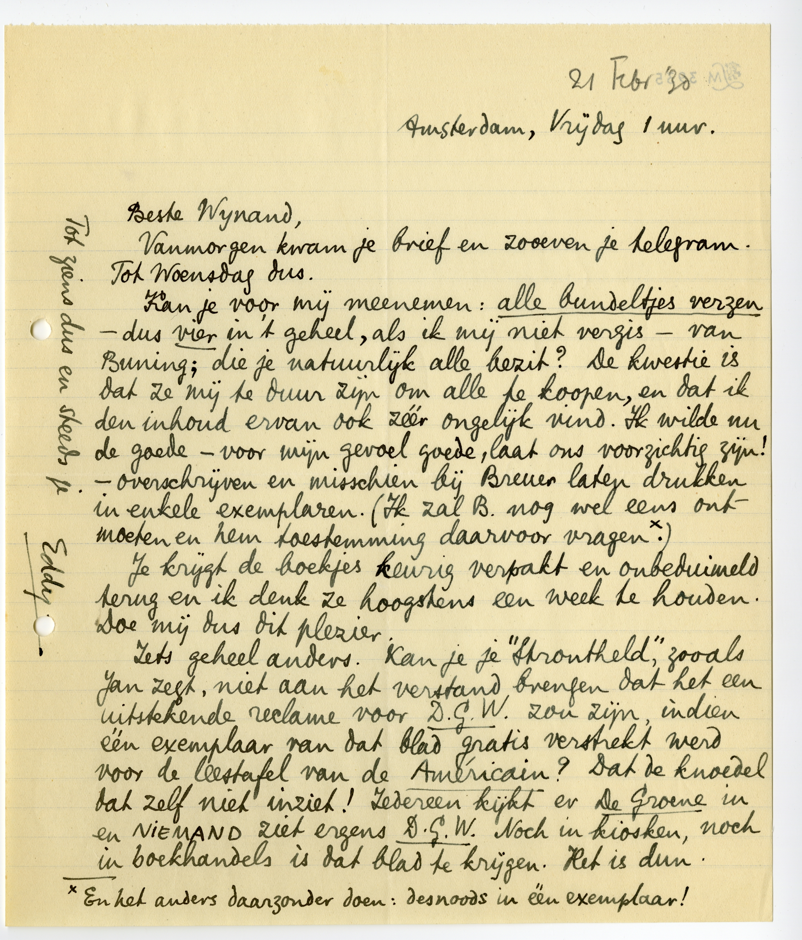 Kan je voor mij meenemen: alle bundeltjes verzen - dus vier in 't geheel, als ik mij niet vergis - van Buning; die je natuurlijk alle bezit? De kwestie is dat ze mij te duur zijn om alle te koopen, en dat ik den inhoud ervan ook zéér ongelijk vind. Ik wilde nu de goede - voor mijn gevoel goede, laat ons voorzichtig zijn! - overschrijven en misschien bij Breuer laten drukken in enkele exemplaren. (Ik zal B. nog wel eens ontmoeten en hem toestemming daarvoor vragen.*)