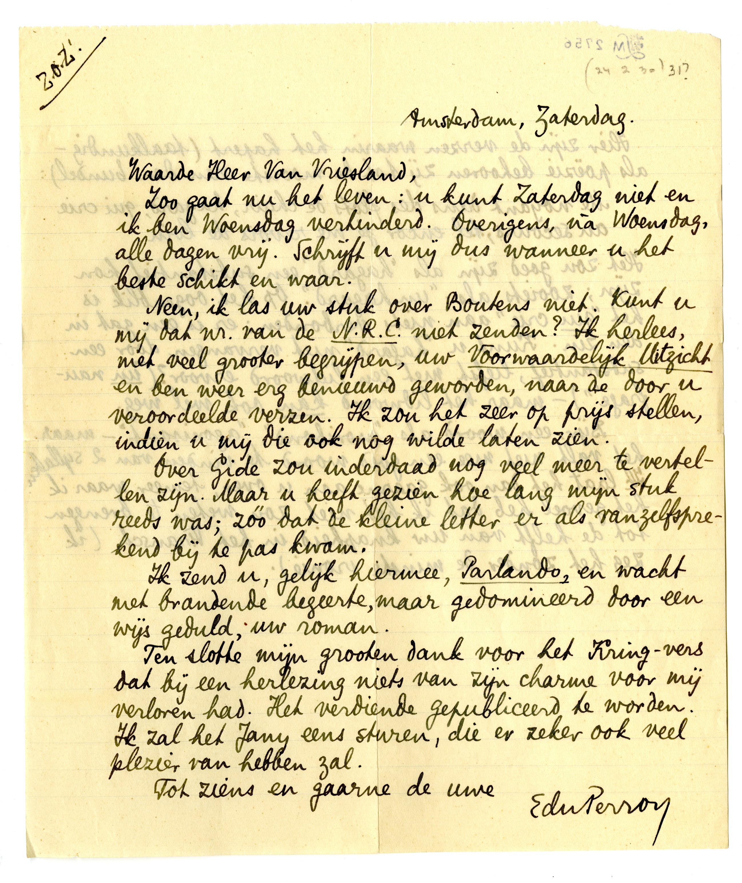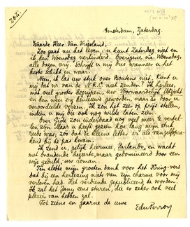 Neen, ik las uw stuk over Boutens908 niet. Kunt u mij dat nr. van de N.R.C. niet zenden? Ik herlees, met veel grooter begrijpen, uw Voorwaardelijk Uitzicht909 en ben weer erg benieuwd geworden, naar de door u veroordeelde verzen. Ik zou het zeer op prijs stellen, indien u mij die ook nog wilde laten zien.