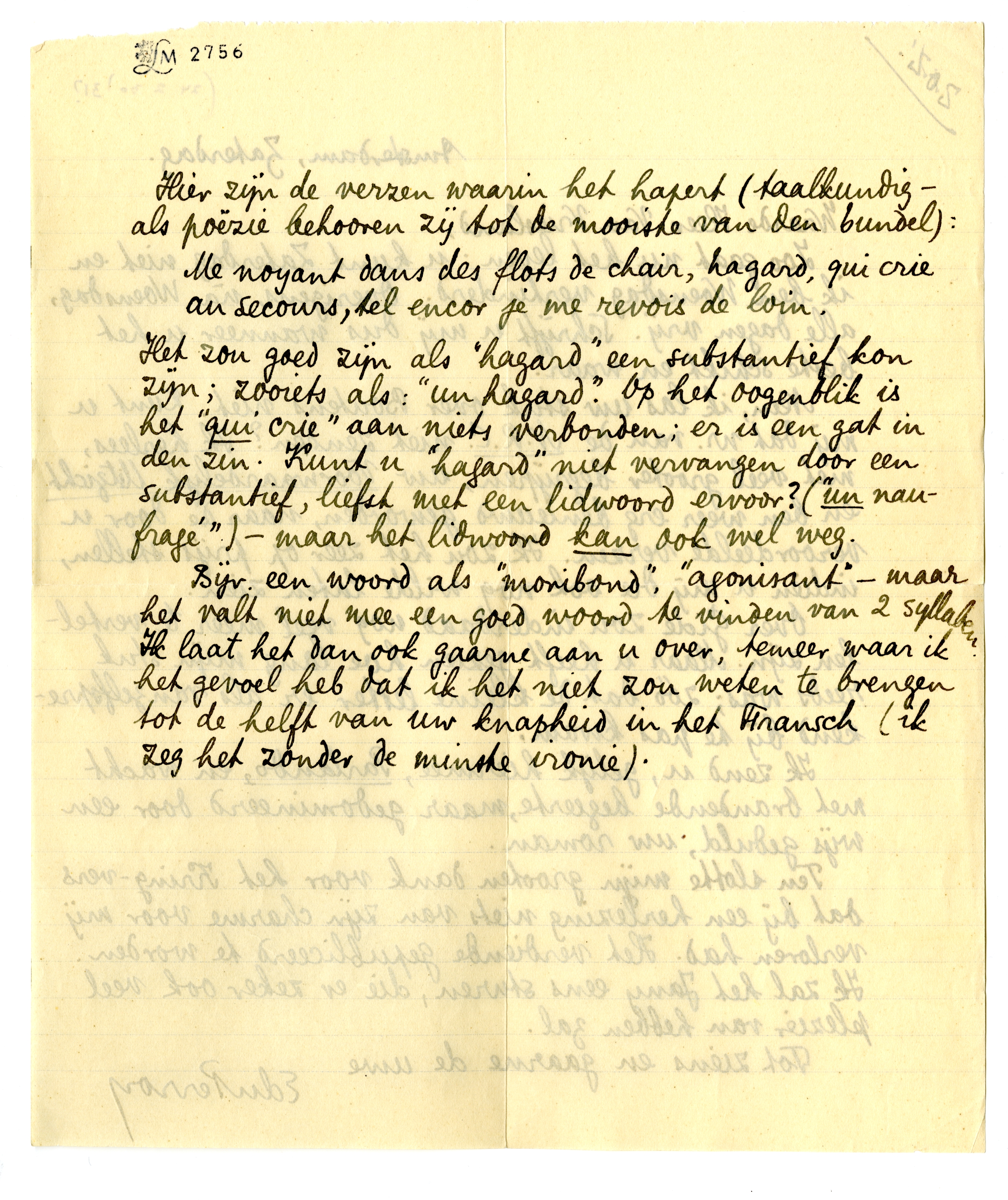 Bijv. een woord als ‘moribond’, ‘agonisant’ - maar het valt niet mee een goed woord te vinden van 2 syllaben. Ik laat het dan ook gaarne aan u over, temeer waar ik het gevoel heb dat ik het niet zou weten te brengen tot de helft van uw knapheid in het Fransch (ik zeg het zonder de minste ironie).