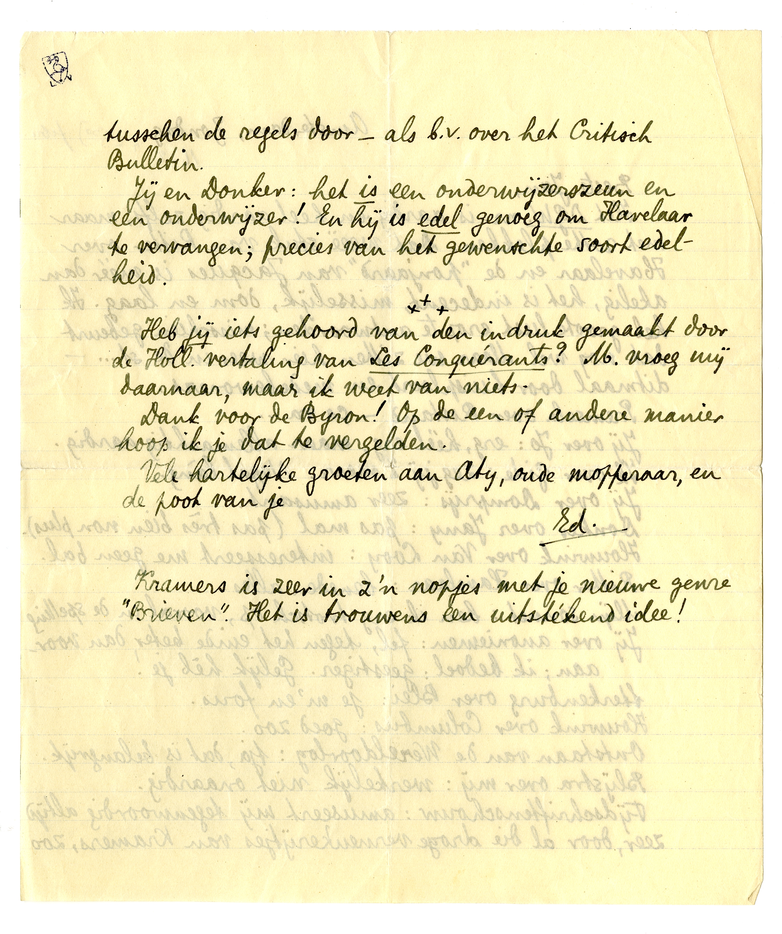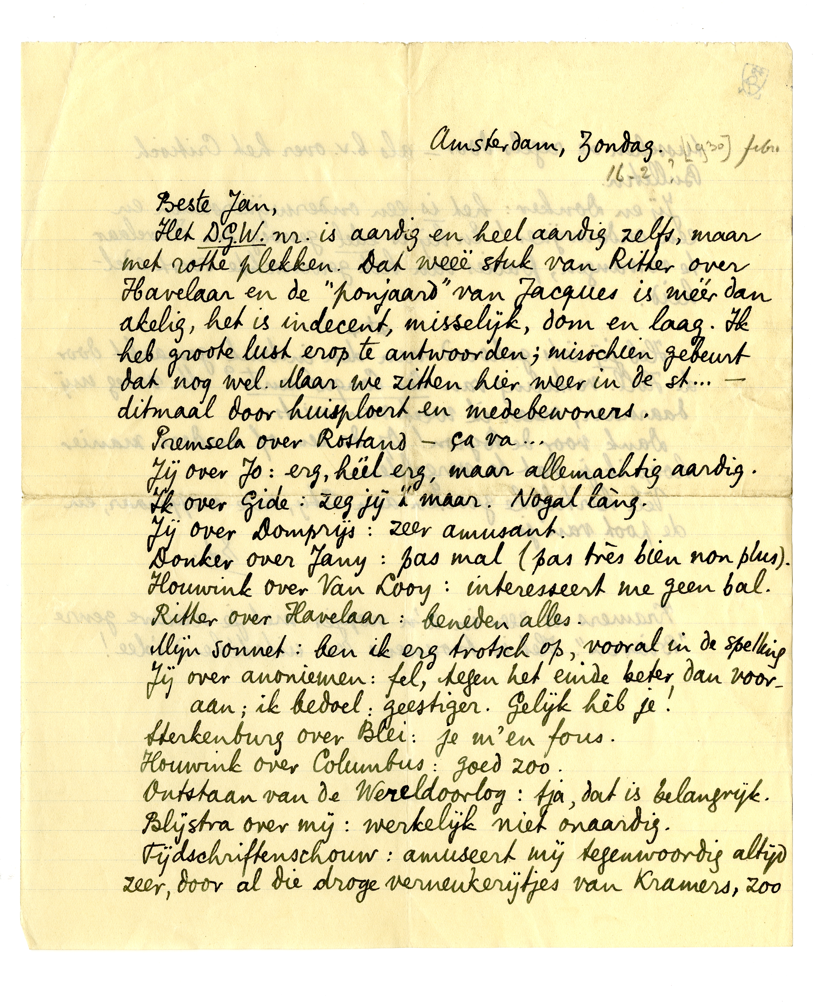 Het D.G.W.nr. is aardig en heel aardig zelfs, maar met rotte plekken. Dat weeë stuk van Ritter over Havelaar en de ‘ponjaard’ van Jacques913 is méér dan akelig, het is indecent, misselijk, dom en laag. Ik heb groote lust erop te antwoorden; misschien gebeurt dat nog wel. Maar we zitten hier weer in de st... - ditmaal door huisploert en medebewoners.