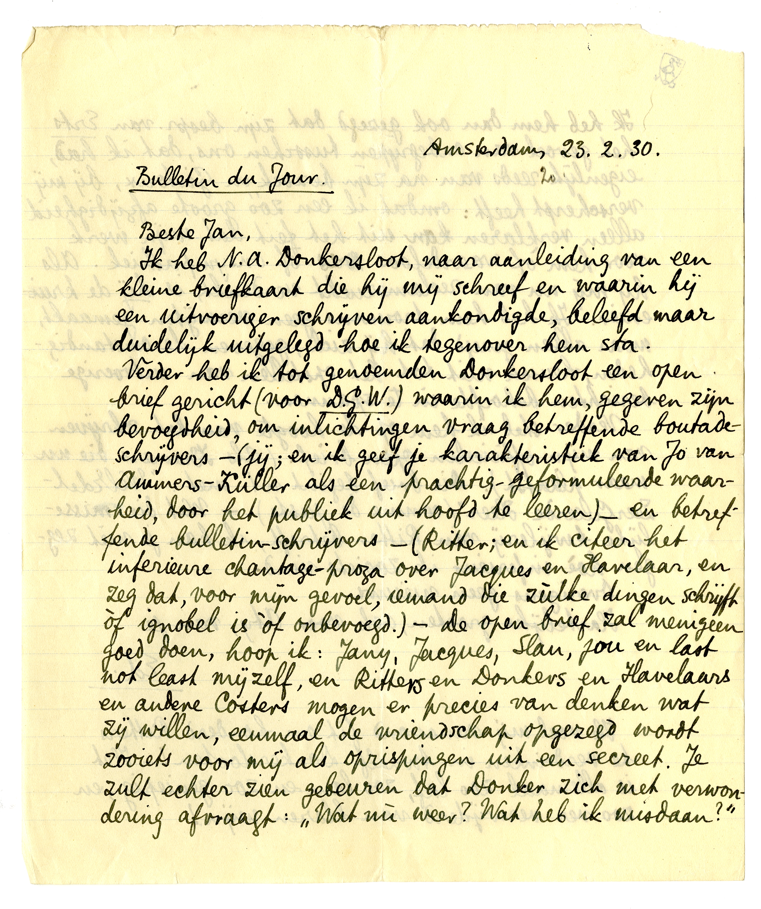 Verder heb ik tot genoemden Donkersloot een open brief gericht (voor D.G.W.) waarin ik hem, gegeven zijn bevoegdheid, om inlichtingen vraag betreffende boutade-schrijvers - (jij; en ik geef je karakteristiek van Jo van Ammers-Küller als een prachtig-geformuleerde waarheid, door het publiek uit het hoofd te leeren) - en betreffende bulletin-schrijvers - (Ritter; en ik citeer het inferieure chantage-proza over Jacques en Havelaar, en zeg dat, voor mijn gevoel, iemand die zúlke dingen schrijft òf ignobel is òf onbevoegd.) - De open brief zal menigeen goed doen, hoop ik: Jany, Jacques, Slau, jou en last not least mijzelf, en Ritters en Donkers en Havelaars en andere Costers mogen er precies van denken wat zij willen, eenmaal de vriendschap opgezegd wordt zooiets voor mij als oprispingen uit een secreet. Je zult echter zien gebeuren dat Donker zich met verwondering afvraag: ‘Wat nù weer’ Wat heb ik misdaan?’ Ik heb hem dan ook gezegd dat zijn bespr. van Erts het gevoel van onbegrijpen tusschen ons, dat ik had, eigenlijk reeds van na zijn bezoek in Gistoux929, bij mij verscherpt heeft: omdat ik een zóó groote afzijdigheid alleen verklaren kan uit het feit dat mijn werk voor hem òf waardeloos is òf onsympathiek. Als hij mij nu van reclamezucht verdenkt, is hij de kruienier. Ik heb hem trouwens geen ver-wijten gemaakt, maar alleen gezegd dat hij zich, gegeven de omstandigheden, heusch niet tot het opstellen van uitvoerige berichten behoefde in te spannen.