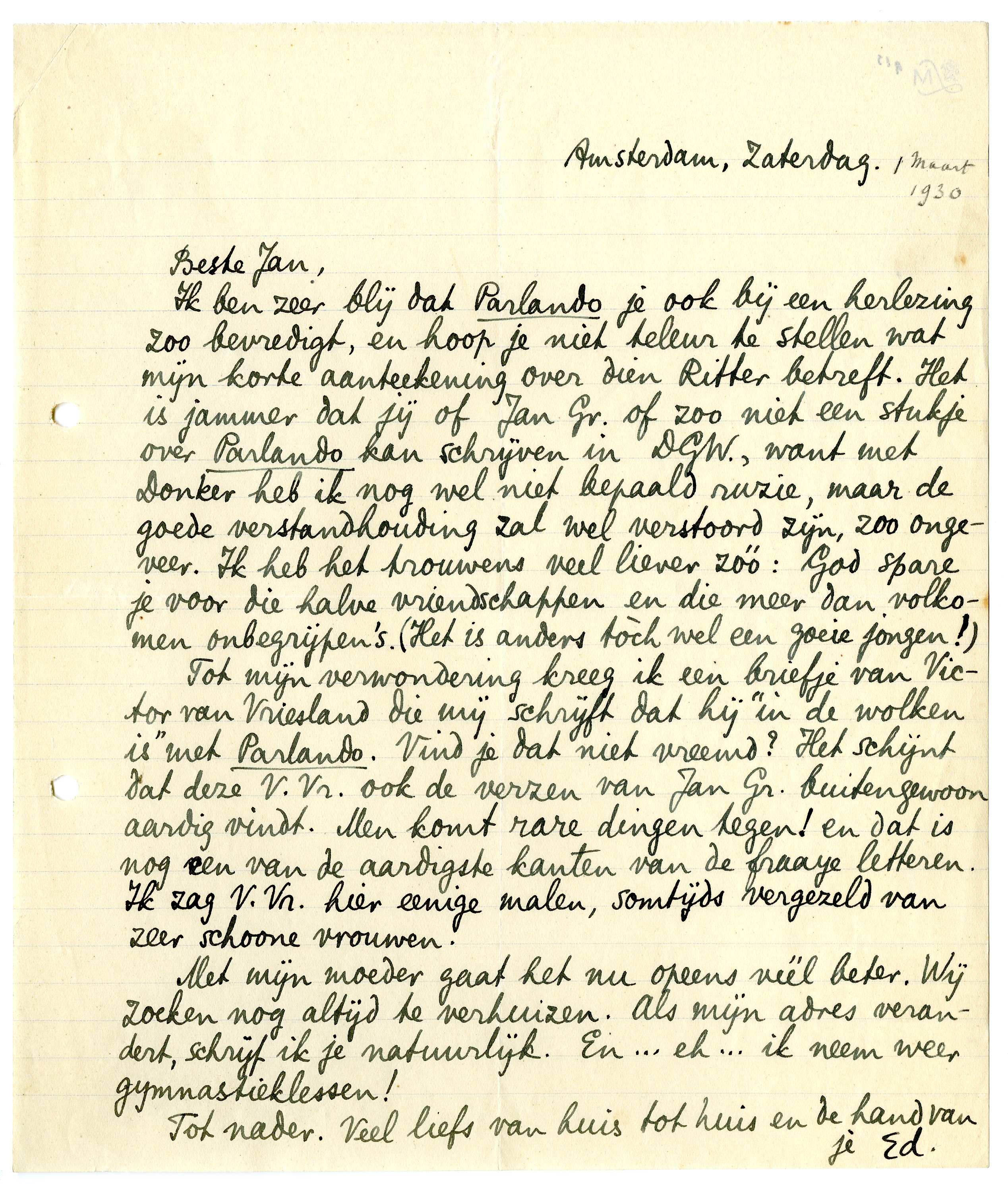 Tot mijn verwondering kreeg ik een briefje van Victor van Vriesland die mij schrijft dat hij ‘in de wolken is’ met Parlando. Vind je dat niet vreemd? Het schijnt dat deze V. Vr. ook de verzen van Jan Gr. buitengewoon aardig vindt. Men komt rare dingen tegen! en dat is nog een van de aardigste kanten van de fraaye letteren. Ik zag V. Vr. hier eenige malen, somtijds vergezeld van zeer schoone vrouwen.