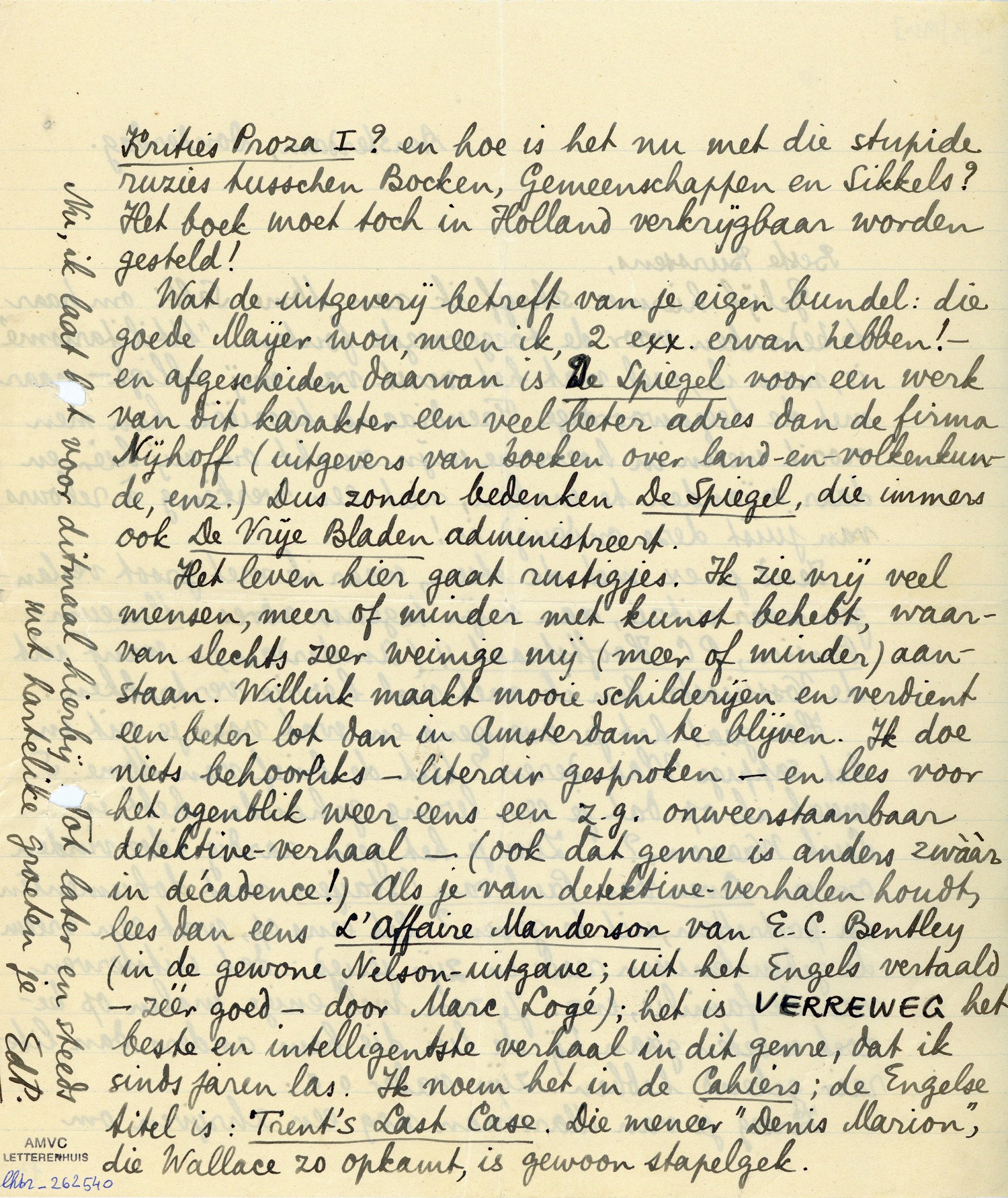 Kreeg je van Marsman nog een schrijven om Krities Proza I? en hoe is het nu met die stupide ruzies tusschen Boeken, Gemeenschappen en Sikkels? Het boek moet toch in Holland verkrijgbaar worden gesteld!