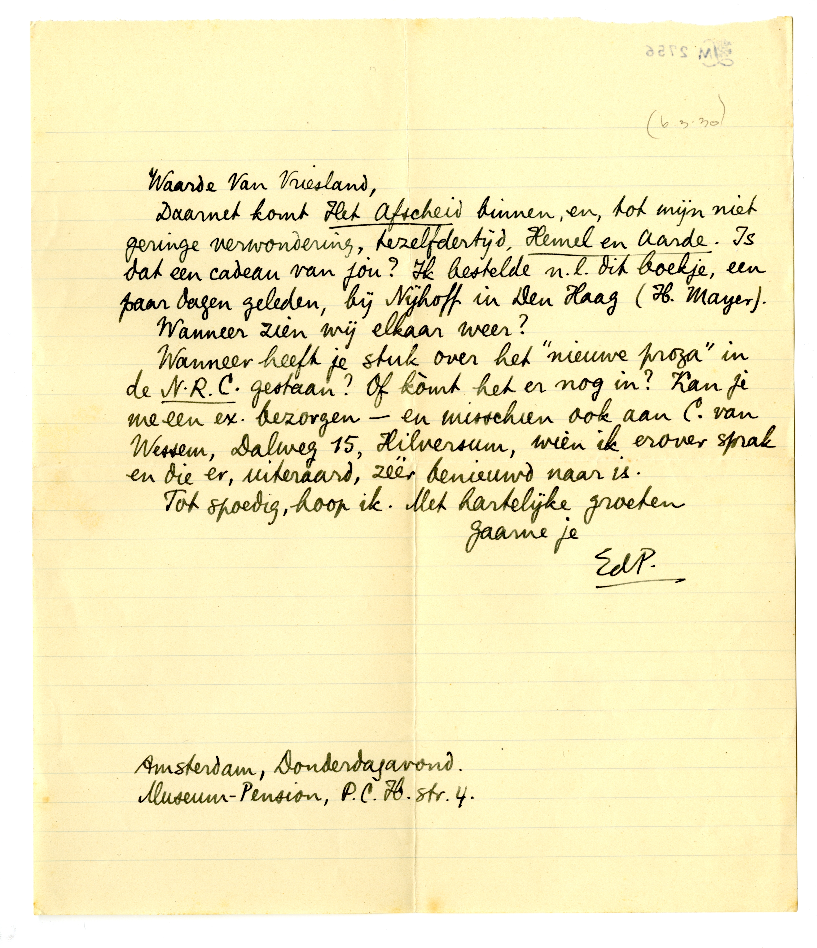 Wanneer heeft je stuk over het ‘nieuwe proza’ in de N.R.C. gestaan? Of kòmt het er nog in? Kan je me een ex. bezorgen - en misschien ook aan C. van Wessem, Dalweg 15, Hilversum, wien ik erover sprak en die er, uiteraard, zéér benieuwd naar is.