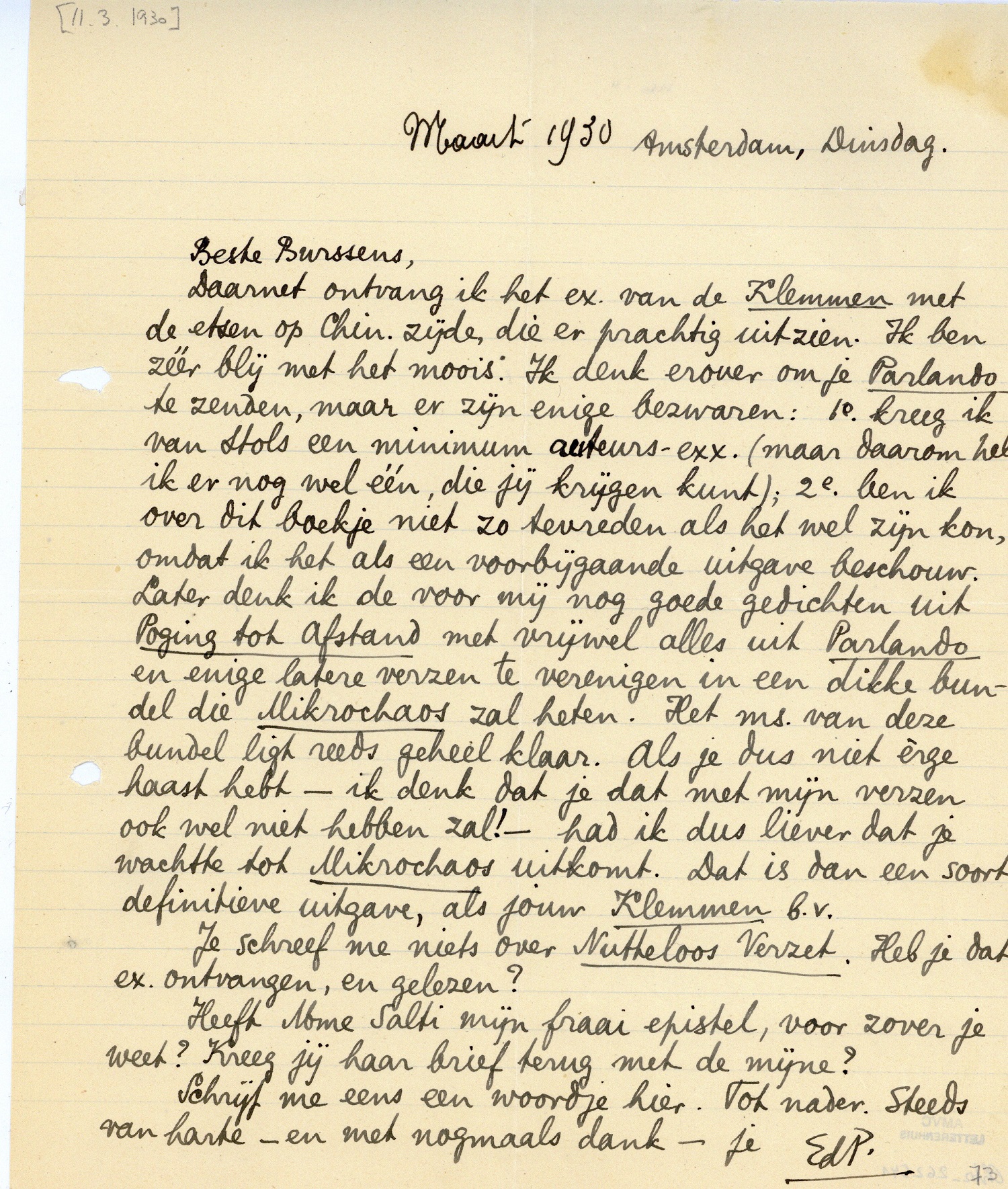 Daarnet ontvang ik het ex. van de Klemmen met de etsen op Chin. zijde, die er prachtig uitzien. Ik ben zéér blij met het moois. Ik denk erover om je Parlando te zenden, maar er zijn enige bezwaren: 1e. kreeg ik van Stols een minimum auteurs-exx. (maar daarom heb ik er nog wel één, die jij krijgen kunt); 2e. ben ik over dit boekje niet zo tevreden als het wel zijn kon, omdat ik het als een voorbijgaande uitgave beschouw. Later denk ik de voor mij nog goede gedichten uit Poging tot Afstand met vrijwel alles uit Parlando en enige latere verzen te verenigen in een dikke bundel die Mikrochaos949 zal heten. Het ms. van deze bundel ligt reeds geheel klaar. Als je dus niet èrge haast hebt - ik denk dat je dat met mijn verzen ook wel niet hebben zal! - had ik dus liever dat je wachtte tot Mikrochaos uitkomt. Dat is dan een soort definitieve uitgave, als jouw Klemmen b.v.