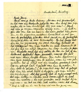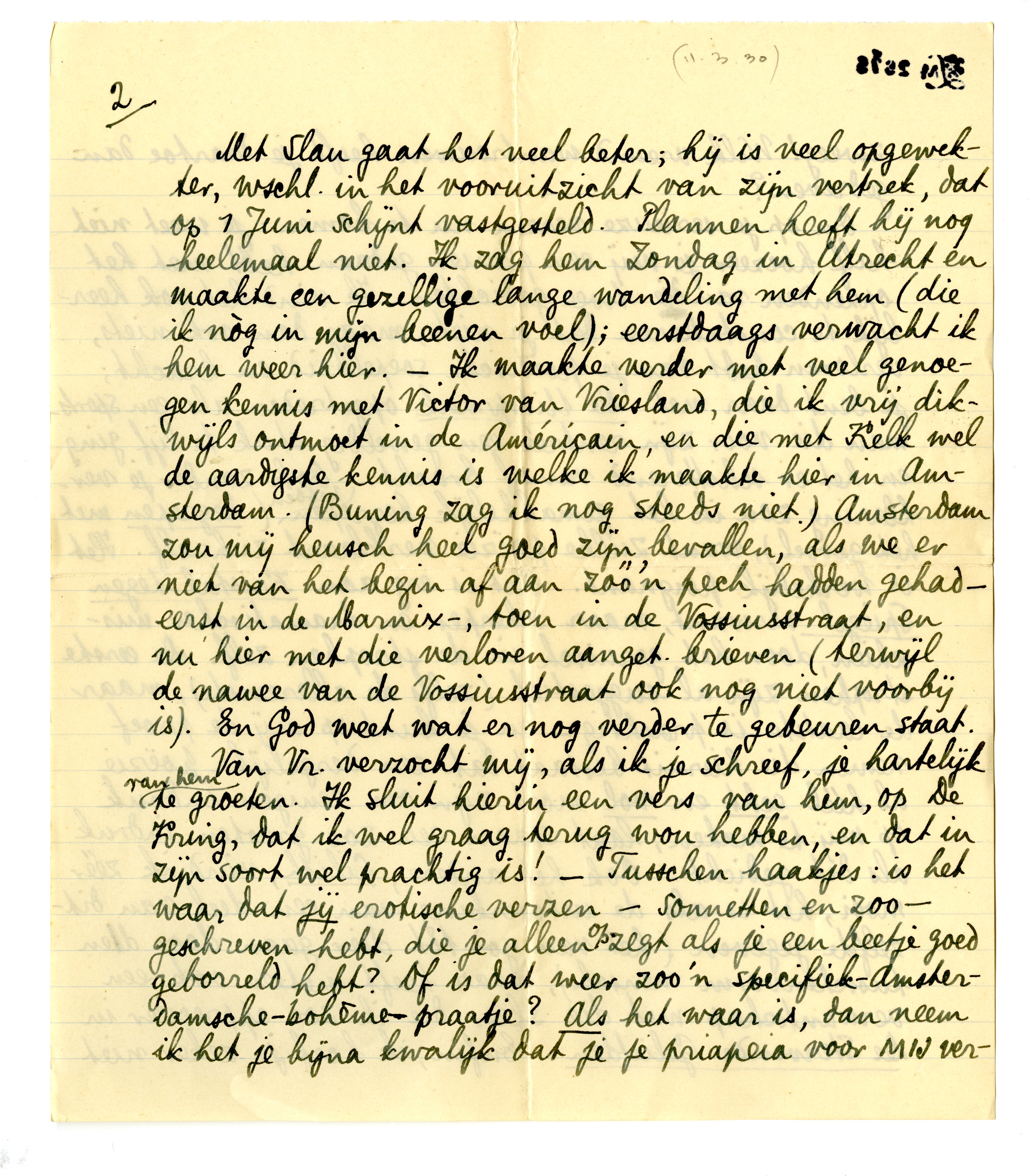 Met Slau gaat het veel beter; hij is veel opgewekter, wschl. in het vooruitzicht van zijn vertrek, dat op 1 Juni schijnt vastgesteld954. Plannen heeft hij nog heelemaal niet. Ik zag hem Zondag in Utrecht en maakte een gezellige lange wandeling met hem (die ik nòg in mijn beenen voel); eerstdaags verwacht ik hem weer hier. - Ik maakte verder met veel genoegen kennis met Victor van Vriesland, die ik vrij dikwijls ontmoet in de Américain, en die met Kelk wel de aardigste kennis is welke ik maakte hier in Amsterdam. (Buning zag ik nog steeds niet.) Amsterdam zou mij heusch heel goed zijn bevallen, als we er niet van het begin af aan zóó'n pech hadden gehad - eerst in de Marnix-, toen in de Vossiusstraat, en nu hier met die verloren aanget. brieven (terwijl de nawee van de Vossiusstraat ook nog niet voorbij is). En God weet wat er nog verder te gebeuren staat.