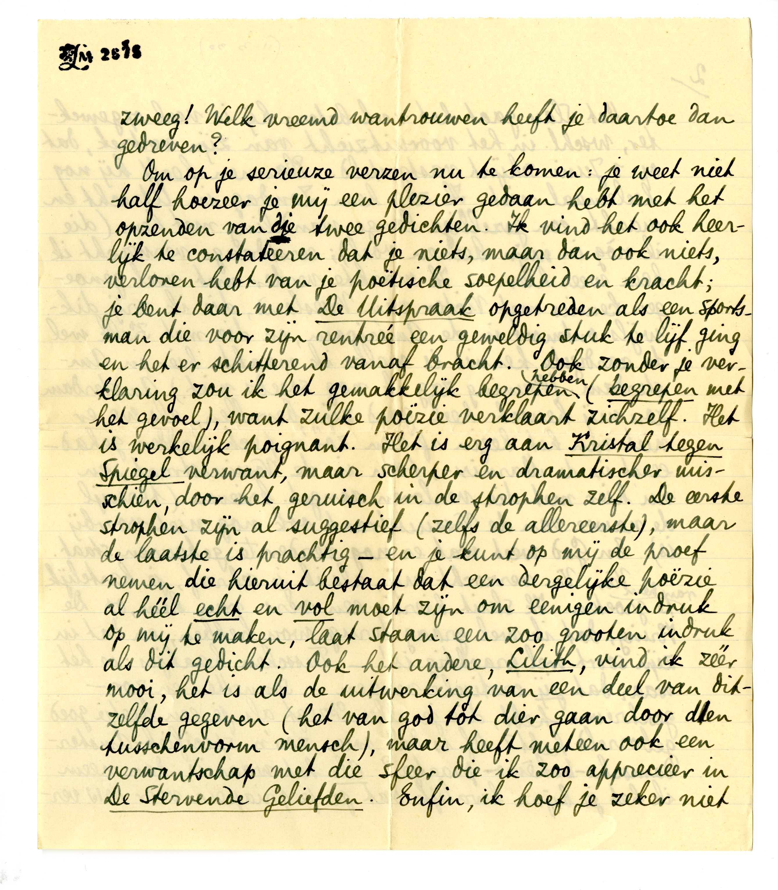 Om op je serieuze verzen nu te komen: je weet niet half hoezeer je mij een plezier gedaan hebt met het opzenden van die twee gedichten. Ik vind het ook heerlijk te constateeren dat je niets, maar dan ook niets, verloren hebt van je poëtische soepelheid en kracht; je bent daar met De Uitspraak opgetreden als een sportsman die voor zijn rentrée een geweldig stuk te lijf ging en het er schitterend vanaf bracht. Ook zonder je verklaring zou ik het gemakkelijk begrepen hebben (begrepen met het gevoel), want zulke poëzie verklaart zichzelf. Het is werkelijk poignant. Het is erg aan Kristal tegen Spiegel verwant, maar scherper en dramatischer misschien, door het geruisch in de strophen zelf. De eerste strophen zijn al suggestief (zelfs de allereerste), maar de laatste is prachtig - en je kunt op mij de proef nemen die hieruit bestaat dat een dergelijke poëzie al héél echt en vol moet zijn om eenigen indruk op mij te maken, laat staan een zoo grooten indruk als dit gedicht. Ook het andere, Lilith, vind ik zéér mooi, het is als de uitwerking van een deel van ditzelfde gegeven (het van god tot dier gaan door den tusschenvorm mensch), maar heeft meteen ook een verwantschap met die sfeer die ik zoo apprecieer in De Stervende Geliefden. Enfin, ik hoef je zeker niet nog méér te vertellen om je ervan te overtuigen dat deze twee gedichten mij zeer getroffen hebben, ook geheel buiten mijn vreugde om dat je je nu weer in poëzie bent gaan uitdrukken. Leve mevrouw Fröbe en Ascona955 - blijf er nog maar een heelen tijd! Het zou gewoon een doodzonde zijn als wij dergelijke gedichten zouden moeten missen voor je verkeer met Kring-en Américain-waardige dieren van een geheel ander gehalte, dan die dat vreemde schurende geluid maakten in die prachtige slotstrophe. - Als ik kritiek op De Uitspraak moest uitoefenen, zou ik alleen zeggen dat de toespraak van de derde figuur misschien iets te lang en te duister is; maar... 1o. gaat deze indruk misschien voorbij bij een zooveelste herlezing, 2o. is het wat lange en gesprokene in die voorlaatste strophen misschien oorzaak dat die laatste strophe zoo poignant in relief komt, met wat er zoo volledig en samengevat weer in gebeurt.