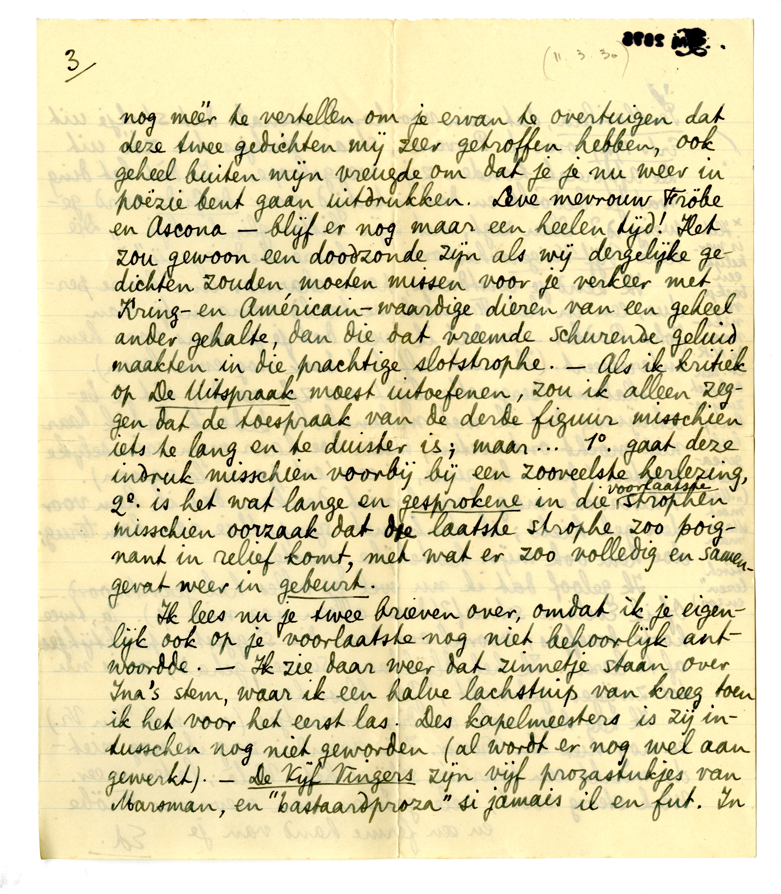 Ik lees nu je twee brieven over, omdat ik je eigenlijk ook op je voorlaatste nog niet behoorlijk antwoordde. - Ik zie daar weer dat zinnetje staan over Ina's stem, waar ik een halve lachstuip van kreeg toen ik het voor het eerst las. Des kapelmeesters is zij intusschen nog niet geworden (al wordt er nog wel aan gewerkt). - De Vijf Vingers zijn vijf prozastukjes van Marsman, en ‘bastaardproza’ si jamais il en fut. In Penthesileia, dat erin voorkomt, evenals dat stukje uit Erts 1929 over de Provence, staan stukjes die zóó uit De Afspraak konden zijn weggeloopen. Is dàt het ding wat je bedoelt en dat indertijd voor De Gids werd geweigerd? Slau zegt, met zijn bitter glimlachje: ‘Die heele Vijf-Vingers-historie is boerenbedriegerij’.*