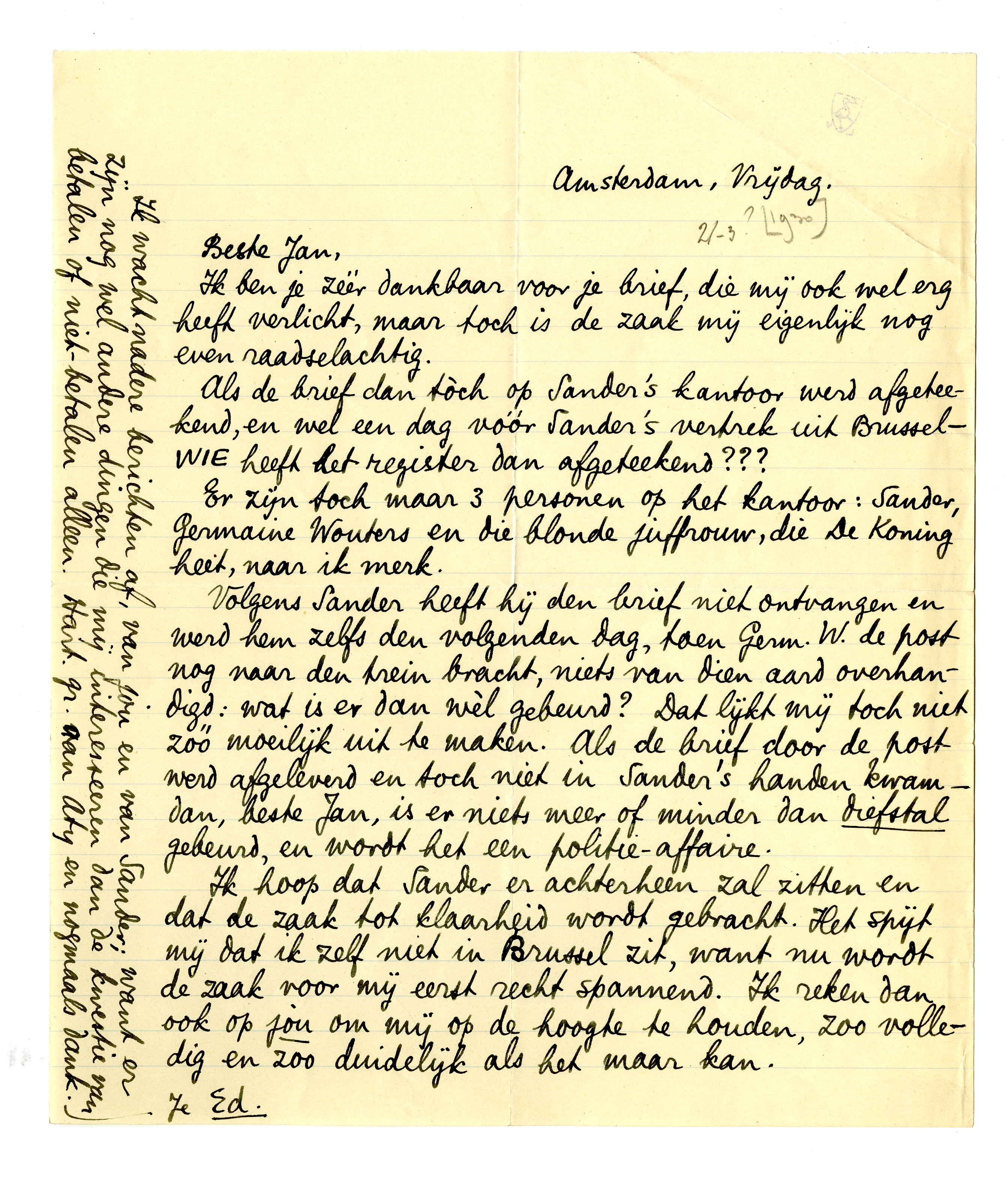 Volgens Sander heeft hij den brief niet ontvangen en werd hem zelfs den volgenden dag, toen Germ.W. de post nog naar den trein bracht, niets van dien aard overhandigd: wat is er dan wèl gebeurd? Dat lijkt mij toch niet zóó moeilijk uit te maken. Als de brief door de post werd afgeleverd en toch niet in Sander's handen kwam, dan, beste Jan, is er niets meer of minder dan diefstal gebeurd, en wordt het een politie-affaire.