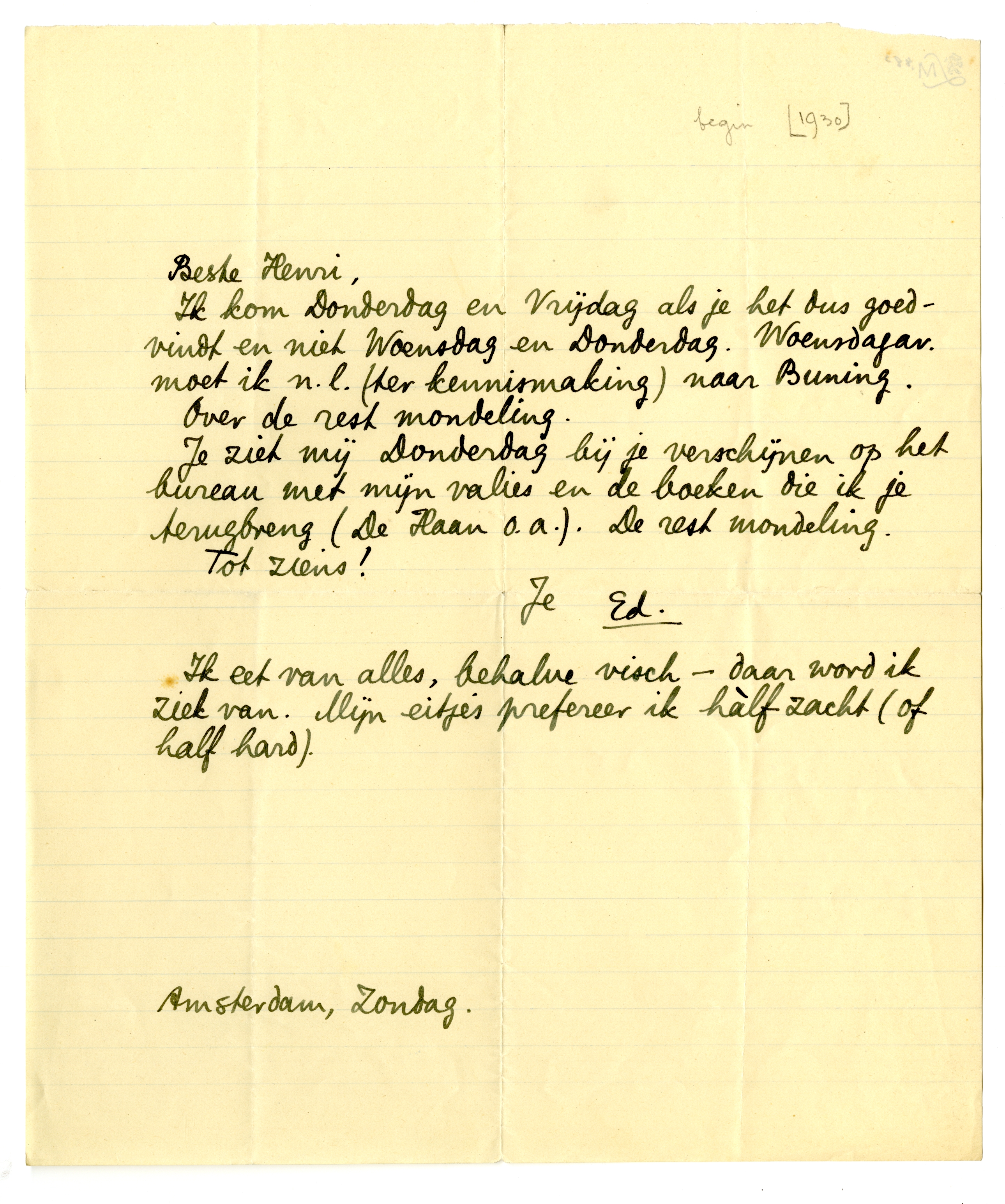 Je ziet mij Donderdag bij je verschijnen op het bureau met mijn valies en de boeken die ik je terugbreng (De Haan o.a.). De rest mondeling.