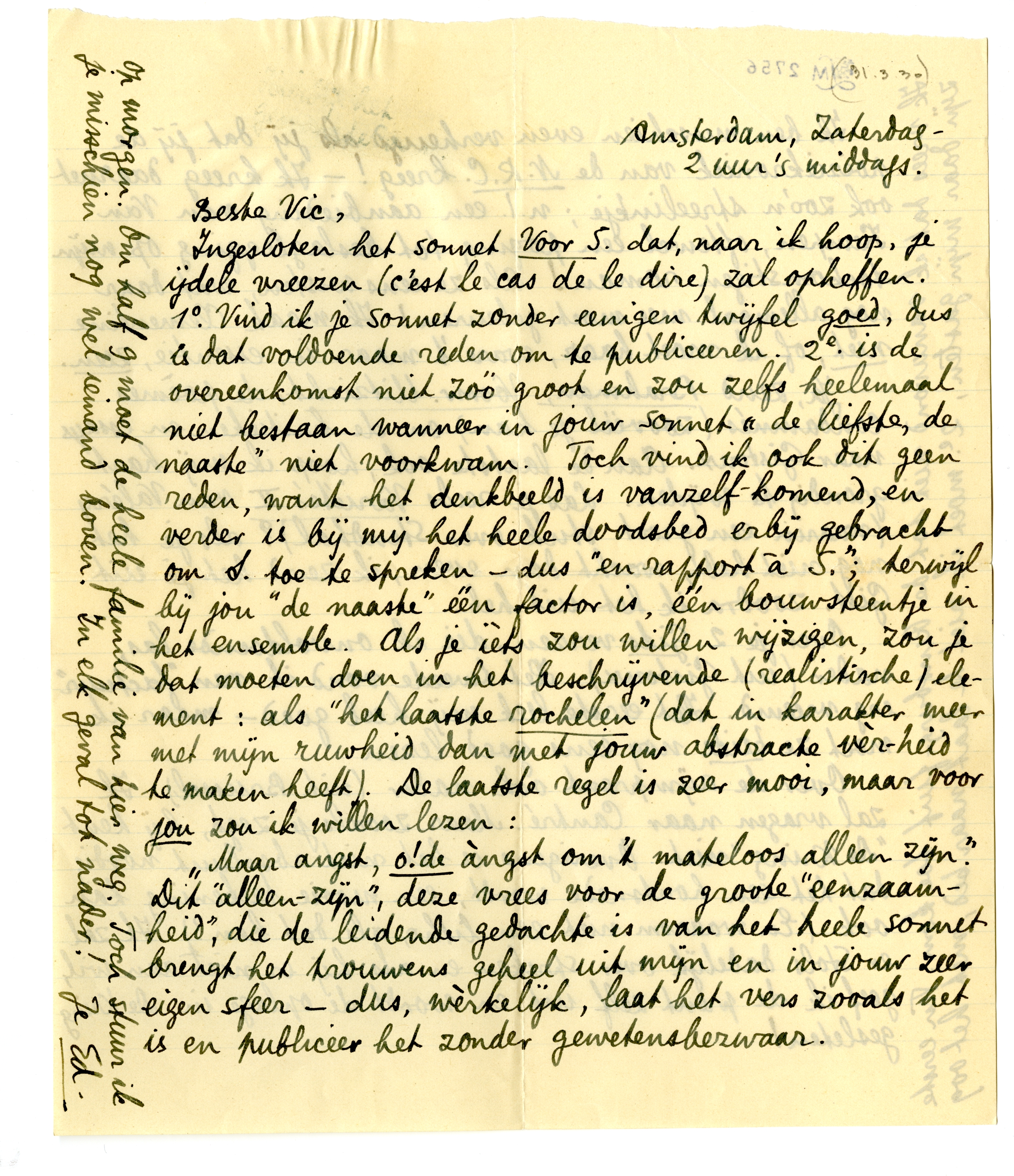Ingesloten het sonnet Voor S. dat, naar ik hoop, je ijdele vreezen (c'est le cas de le dire) zal opheffen. 1o. Vind ik je sonnet1000 zonder eenigen twijfel goed, dus is dat voldoende reden om te publiceeren. 2e. is de overeenkomst niet zóó groot en zou zelfs heelemaal niet bestaan wanneer in jouw sonnet ‘de liefste, de naaste’ niet voorkwam. Toch vind ik ook dit geen reden, want het denkbeeld is vanzelf-komend, en verder is bij mij het heele doodsbed erbij gebracht om S. toe te spreken - dus ‘en rapport à S.’; terwijl bij jou ‘de naaste’ één factor is, één bouwsteentje in het ensemble. Als je ièts zou willen wijzigen, zou je dat moeten doen in het beschrijvende (realistische) element: als ‘het laatste rochelen’ (dat in karakter meer met mijn ruwheid dan met jou abstracte vèr-heid te maken heeft). De laatste regel is zeer mooi, maar voor jou zou ik willen lezen: