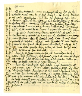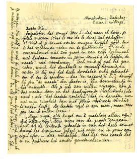 Over de rijmprent ook nader (uit Brussel). Ik zal vragen naar Cantré. Maar zooals je zegt, hij kent ‘De Kring’ niet. Overigens is het niet absoluut noodig dat het een houtsnede wordt; een mooie teekening kan ook. (En waarom niet een litho, als dat kan?) Ik zal er Stols dadelijk over spreken en als hij er niet aan wil, geef ik de prent zelf uit en wordt de oplage in De Kring gesleten!