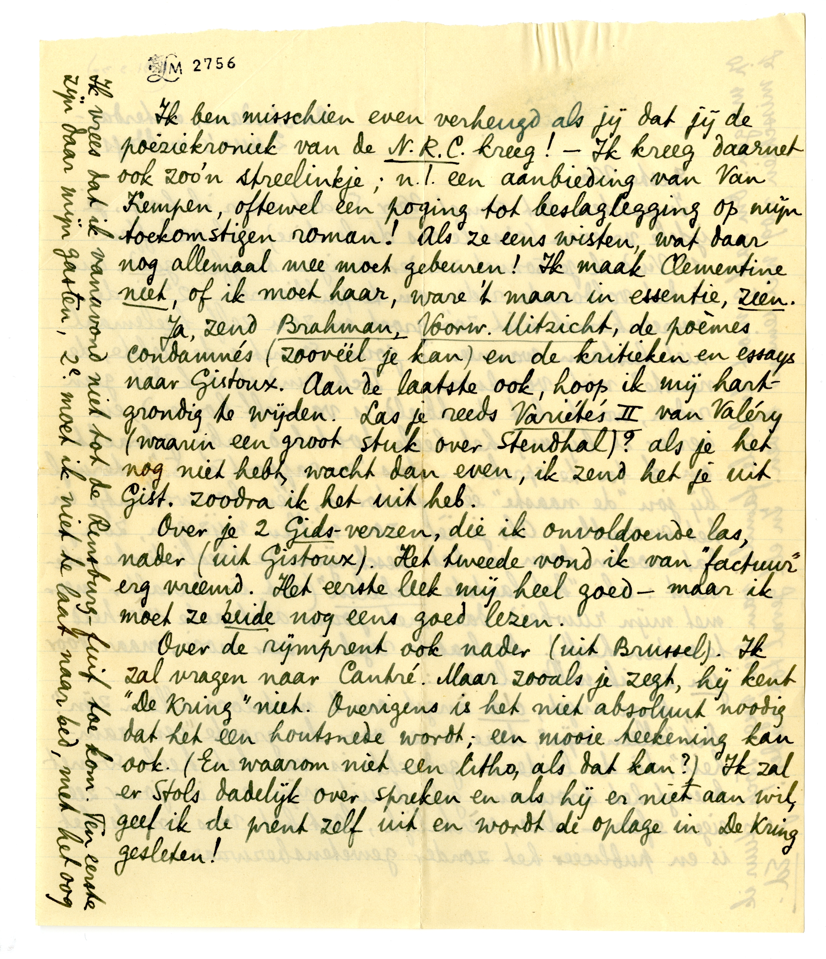 Ik ben misschien even verheugd als jij dat jij de poëziekroniek van de N.R.C. kreeg1002! - Ik kreeg daarnet ook zoo'n streelinkje; n.l. een aanbieding van Van Kempen1003, oftewel een poging tot beslaglegging op mijn toekomstigen roman! Als ze eens wisten, wat daar nog allemaal mee moet gebeuren! Ik maak Clementine1004 niet, of ik moet haar, ware 't maar in essentie, zien.