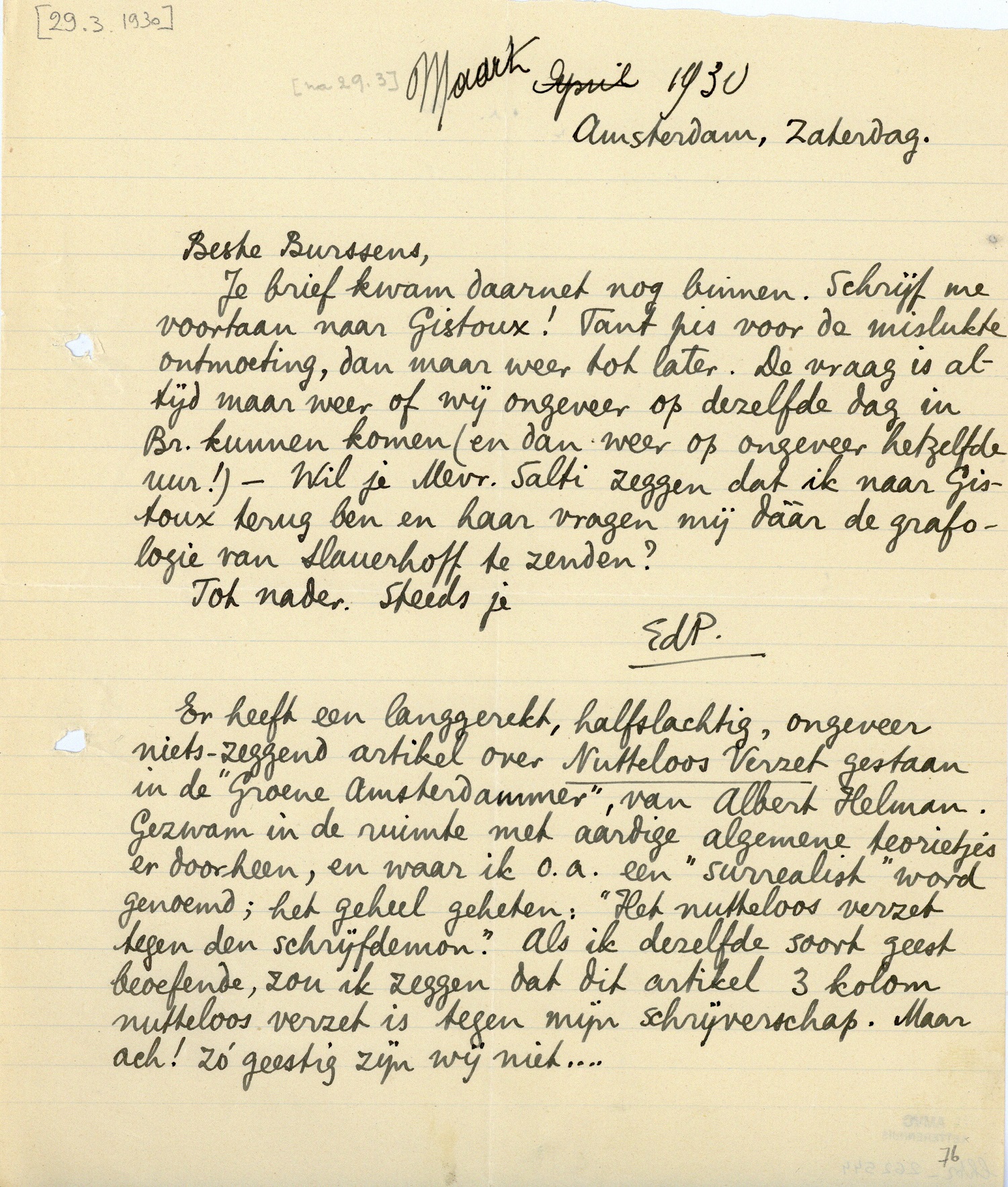 Er heeft een langgerekt, halfslachtig, ongeveer niets-zeggend artikel over Nutteloos Verzet gestaan in de ‘Groene Amsterdammer’1005, van Albert Helman. Gezwam in de ruimte met aardige algemene teorietjes er doorheen, en waar ik o.a. een ‘surrealist’ word genoemd; het geheel geheten: ‘Het nutteloos verzet tegen den schrijfdemon’. Als ik dezelfde soort geest beoefende, zou ik zeggen dat dit artikel 3 kolom nutteloos verzet is tegen mijn schrijverschap. Maar ach! zó geestig zijn wij niet....