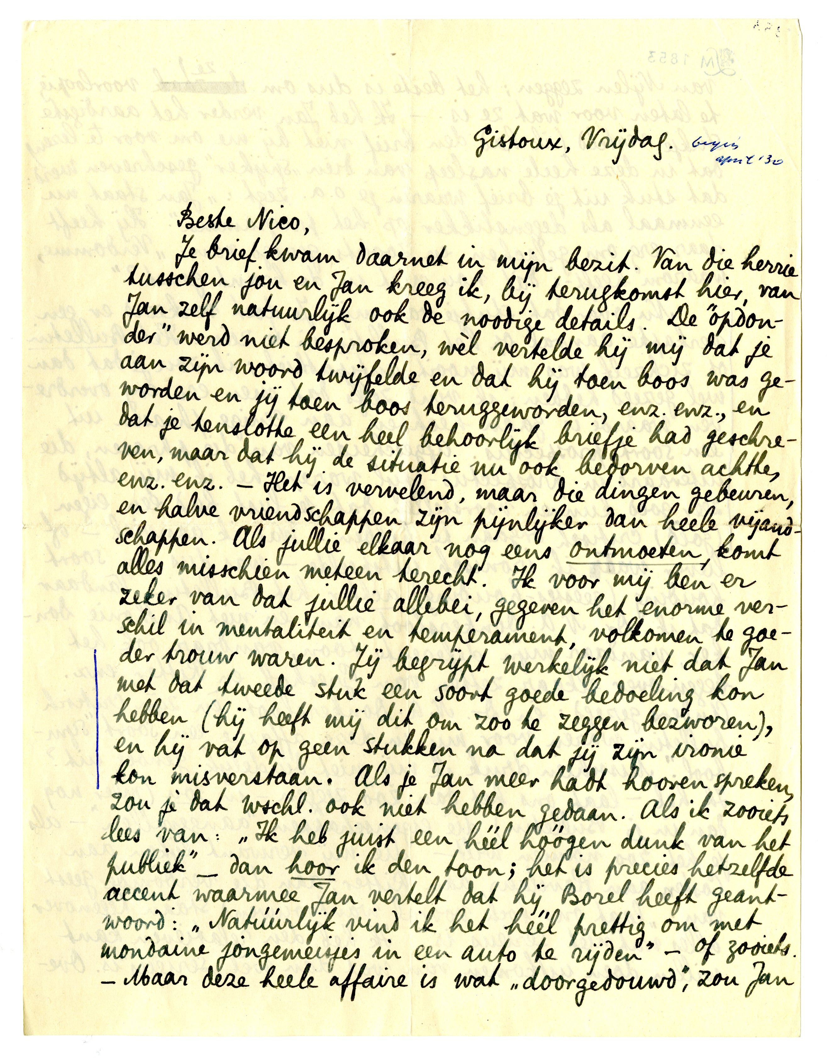 Je brief kwam daarnet in mijn bezit. Van die herrie tusschen jou en Jan kreeg ik, bij terugkomst hier, van Jan zelf natuurlijk ook de noodige details. De ‘opdonder’ werd niet besproken, wèl vertelde hij mij dat je aan zijn woord twijfelde en dat hij toen boos was geworden en jij toen boos teruggeworden, enz. enz., en dat je tenslotte een heel behoorlijk briefje had geschreven, maar dat hij de situatie nu ook bedorven achtte, enz. enz. - Het is vervelend, maar die dingen gebeuren, en halve vriendschappen zijn pijnlijker dan heele vijandschappen. Als jullie elkaar nog eens ontmoeten, komt alles misschien meteen terecht. Ik voor mij ben er zeker van dat jullie allebei, gegeven het enorme verschil in mentaliteit en temperament, volkomen te goeder trouw waren. Jij begrijpt werkelijk niet dat Jan met dat tweede stuk een soort goede bedoeling kon hebben (hij heeft mij dit om zoo te zeggen bezworen), en hij vat op geen stukken na dat jij zijn ironie kon misverstaan. Als je Jan meer hadt hooren spreken, zou je dat wschl. ook niet hebben gedaan. Als ik zooiets lees van: ‘Ik heb juist een héél hóógen dunk van het publiek’ - dan hoor ik den toon; het is precies hetzelfde accent waarmee Jan vertelt dat hij Borel heeft geantwoord: ‘Natúúrlijk vind ik het héél prettig om met mondaine jongemeisjes in een auto te rijden’ - of zooiets. - Maar deze heele affaire is wat ‘doorgedouwd’, zou Jan van Nijlen zeggen; het beste is dus om ze voorloopig te laten voor wat ze is. - Ik heb Jan verder het aardigste stukje verteld (ik had den brief niet bij me om voor te lezen) dat in deze heele nasleep van dien ‘spijker’ geschreven werd: dat stuk uitje brief waarin je o.a. zegt: ‘Jan staat nu eenmaal als degenslikker op het programma’. Hij heeft daar erg om gelachen, en zooiets gezegd van: ‘Verdomme, waarom heeft-i dàt nou niet in de krant gezet?’
