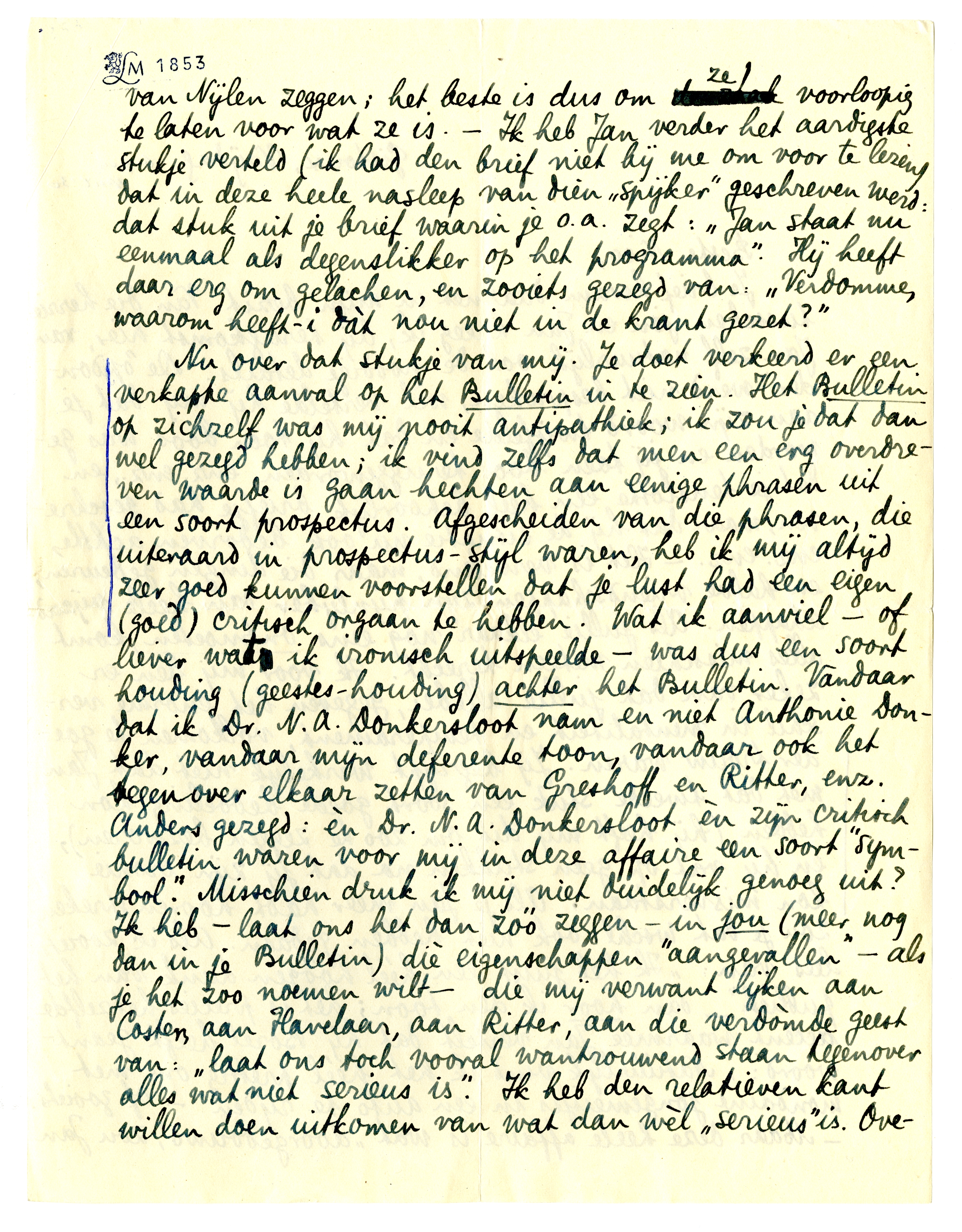 Nu over dat stukje van mij. Je doet verkeerd er een verkapte aanval op het Bulletin in te zien. Het Bulletin op zichzelf was mij nooit antipathiek; ik zou je dat dan wel gezegd hebben; ik vind zelfs dat men een erg overdreven waarde is gaan hechten aan eenige phrasen uit een soort prospectus. Afgescheiden van die phrasen, die uiteraard in prospectus-stijl waren, heb ik mij altijd zeer goed kunnen voorstellen dat je lust had een eigen (goed) critisch orgaan te hebben. Wat ik aanviel - of liever wat ik ironisch uitspeelde - was dus een soort houding (geestes-houding) achter het Bulletin. Vandaar dat ik Dr. N.A. Donkersloot nam en niet Anthonie Donker, vandaar mijn deferente toon, vandaar ook het tegenover elkaar zetten van Greshoff en Ritter, enz. Anders gezegd: èn Dr. N.A. Donkersloot èn zijn critisch bulletin waren voor mij in deze affaire een soort ‘symbool’. Misschien druk ik mij niet duidelijk genoeg uit? Ik heb - laat ons het dan zóó zeggen - in jou (meer nog dan in je Bulletin) diè eigenschappen ‘aangevallen’ - als je het zoo noemen wilt - die mij verwant lijken aan Coster, aan Havelaar, aan Ritter, aan die verdòmde geest van: ‘laat ons toch vooral wantrouwend staan tegenover alles wat niet serieus is’. Ik heb den relatieven kant willen doen uitkomen van wat dan wèl ‘serieus’ is. Overigens weet je wat ik van die manifestatie van Ritter tegen Jacques denk, en de zes of zeven zinnetjes die ik aan dien aanval* wijdde, wil ik nog altijd grààg weerlegd zien: hetzij door Ritter zelf, hetzij door jou. Het antwoord van Ritter aan Jan (dat ik niet las dan in D.G.W.) was één karakterloos, niets-zeggend en vooral niets-verklarend gelùl; de geniepigheid die ligt, juist in dat ongemerkte overloopen van zijn metaphoor in de realiteit, blijft bestaan. Als hij dat zoo niet ‘bedoeld’ heeft, is hij een ondelicate idioot. Ik laat hem geen andere keuze. Maar ik gelóóf niet aan zijn idiotie, dat is het erge; ik geloof nog altijd hier te maken te hebben met een overheerlijk staaltje van die misselijke, laffe smeerlapperij waartoe alleen een ethicus, - een ‘edeldenker’ van beroep - in staat is. Dit is ook ongeveer het gevoelen van Jacques.