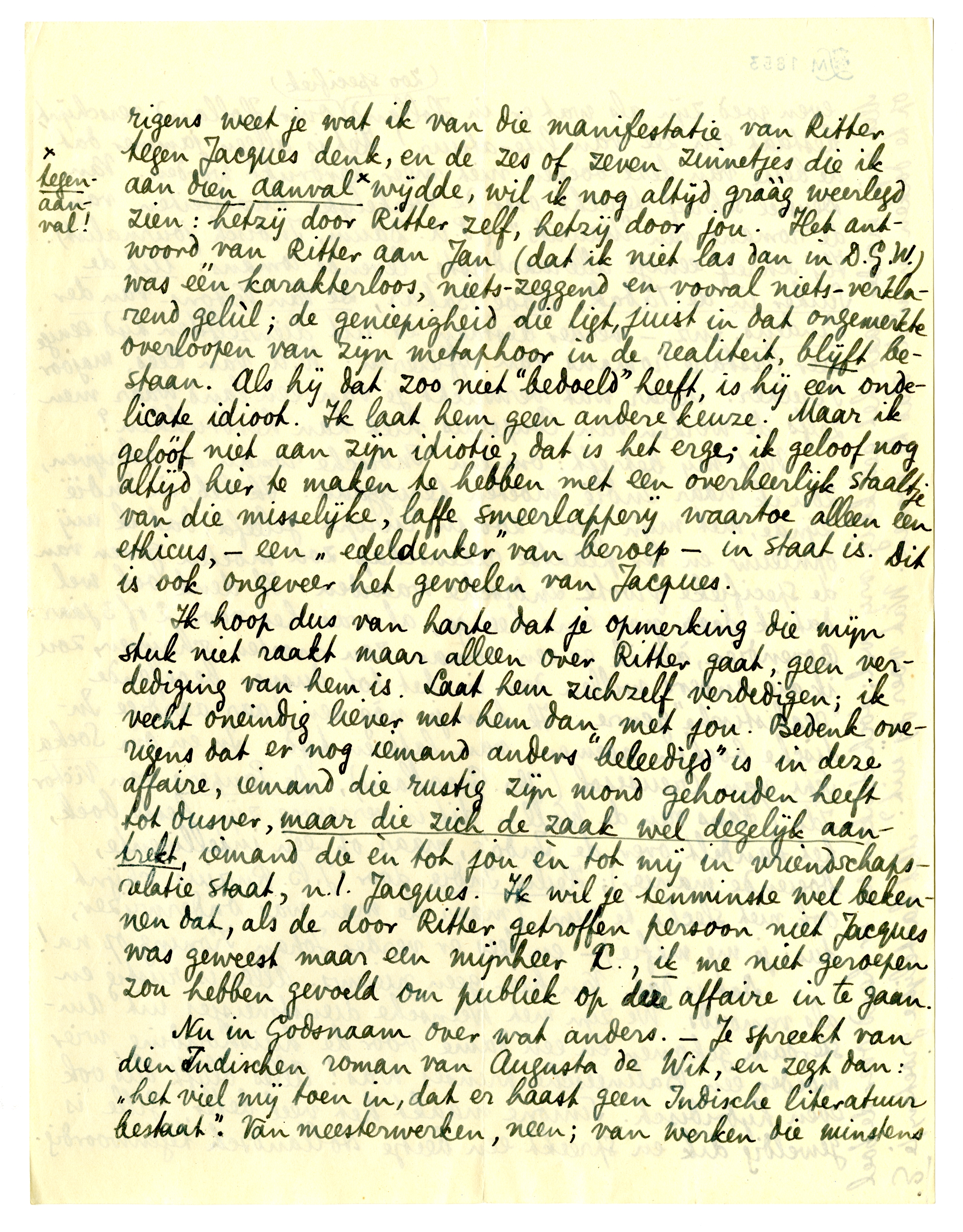 Ik hoop dus van harte dat je opmerking die mijn stuk niet raakt maar alleen over Ritter gaat, geen verdediging van hem is. Laat hem zichzelf verdedigen; ik vecht oneindig liever met hem dan met jou. Bedenk overigens dat er nog iemand anders ‘beleedigd’ is in deze affaire, iemand die rustig zijn mond gehouden heeft tot dusver, maar die zich de zaak wel degelijk aantrekt, iemand die èn tot jou èn tot mij in vriendschapsrelatie staat, n.l. Jacques. Ik wil je tenminste wel bekennen dat, als de door Ritter getroffen persoon niet Jacques was geweest maar een mijnheer X., ik me niet geroepen zou hebben gevoeld om publiek op deze affaire in te gaan.