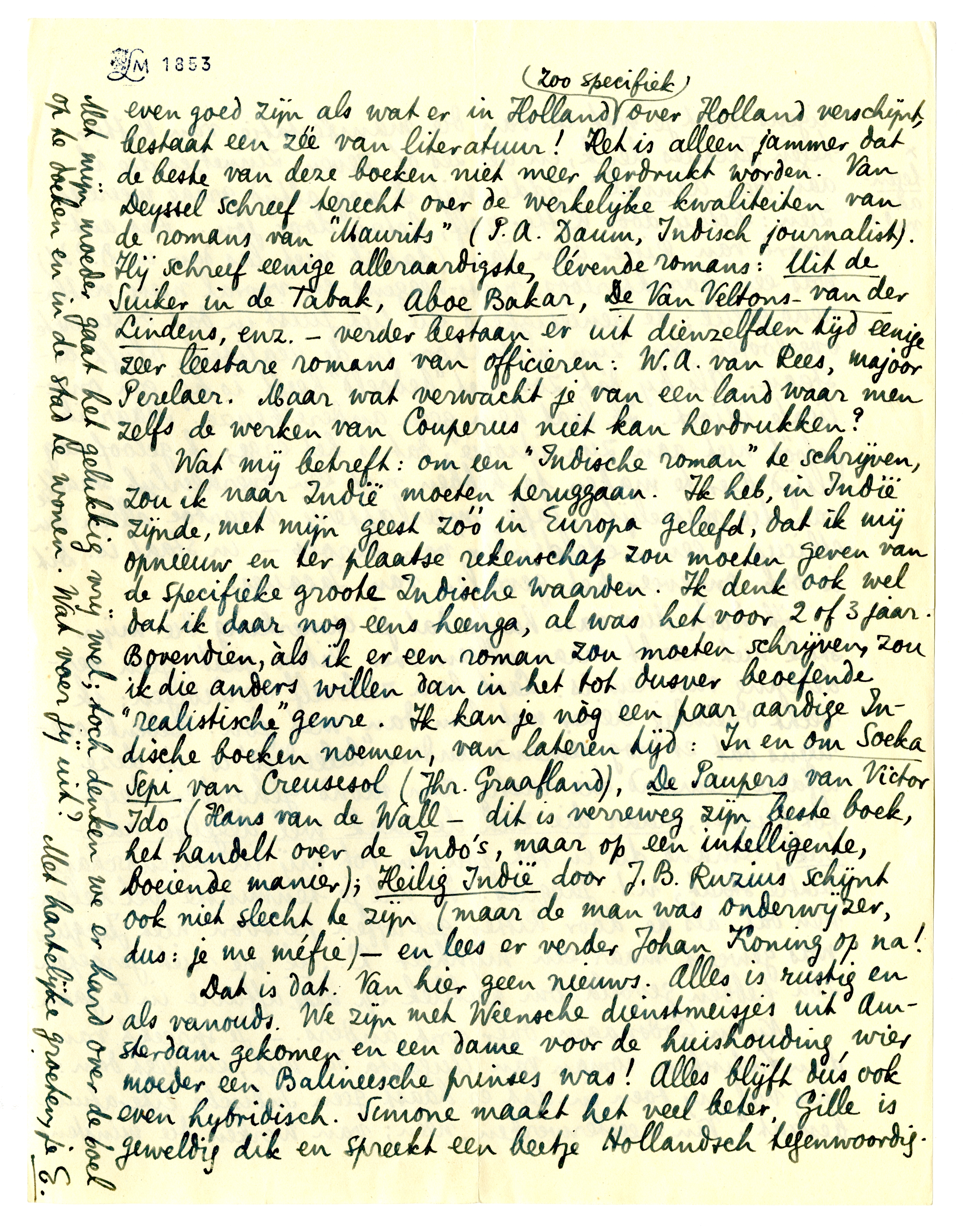 Nu in Godsnaam over wat anders. - Je spreekt van dien Indischen roman van Augusta de Wit1013, en zegt dan: ‘het viel mij toen in, dat er haast geen Indische literatuur bestaat’. Van meesterwerken, neen; van werken die minstens even goed zijn als wat er in Holland zoo specifiek over Holland verschijnt, bestaat een zéé van literatuur! Het is alleen jammer dat de beste van deze boeken niet meer herdrukt worden. Van Deyssel schreef terecht over de werkelijke kwaliteiten van de romans van ‘Maurits’ (P.A. Daum, Indisch journalist). Hij schreef eenige alleraardigste lévende romans: Uit de Suiker in de Tabak, Aboe Bakar, De Van Veltons-van der Lindens, enz. - verder bestaan er uit dienzelfden tijd eenige zeer leesbare romans van officieren: W.A. van Rees, majoor Perelaer. Maar wat verwacht je van een land waar men zelfs de werken van Couperus niet kan herdrukken?