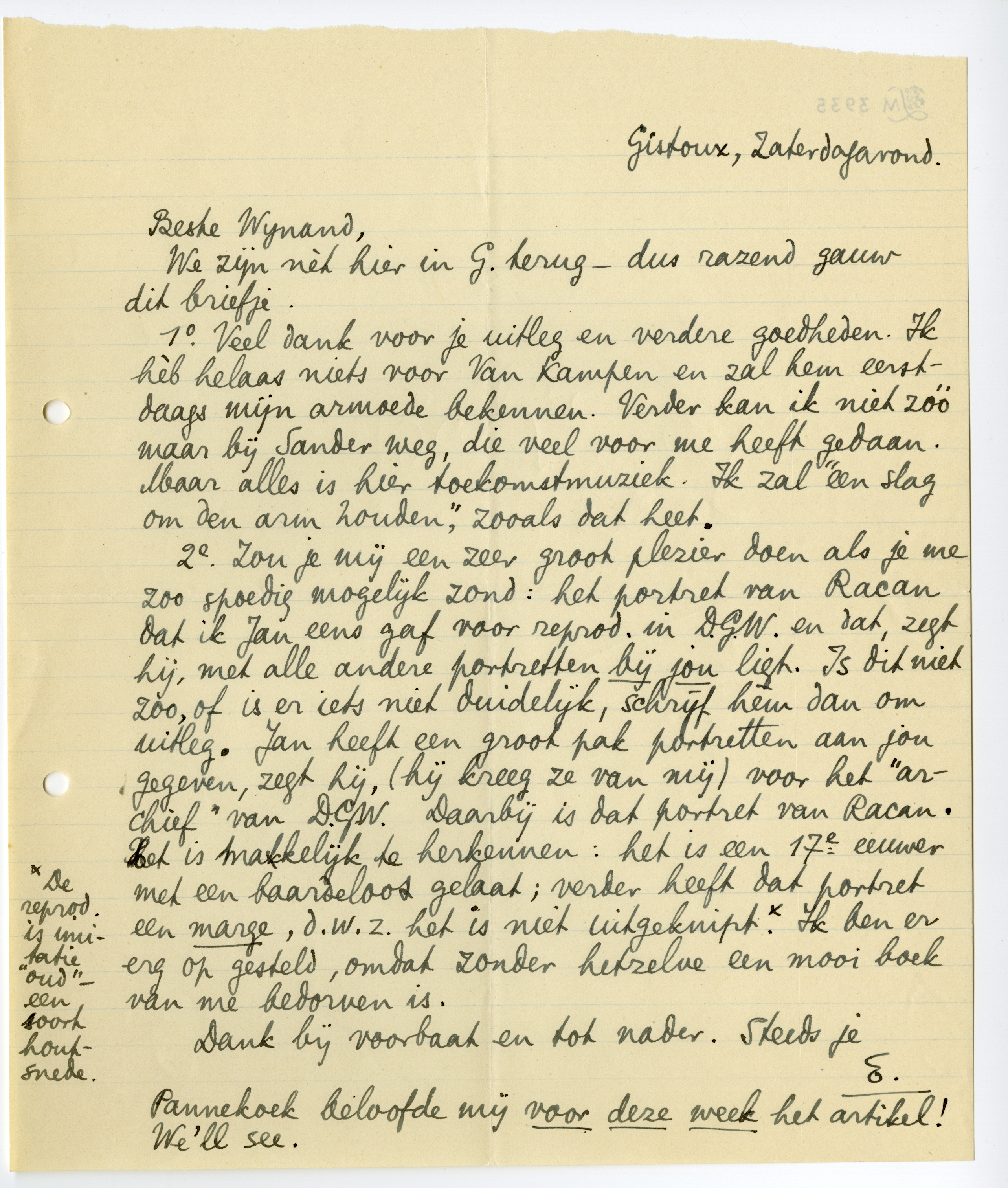 2e. Zou je mij een zeer groot plezier doen als je me zoo spoedig mogelijk zond: het portret van Racan dat ik Jan eens gaf voor reprod. in D.G.W. en dat, zegt hij, met alle andere portretten bij jou ligt. Is dit niet zoo, of is er iets niet duidelijk, schrijf hèm dan om uitleg. Jan heeft een groot pak portretten aan jou gegeven, zegt hij, (hij kreeg ze van mij) voor het ‘archief’ van D.G.W. Daarbij is dat portret van Racan. Het is makkelijk te herkennen: het is een 17e eeuwer met een baardeloos gelaat; verder heeft dat portret een marge, d.w.z. het is niet uitgeknipt.* Ik ben er erg op gesteld, omdat zonder hetzelve een mooi boek van me bedorven is.