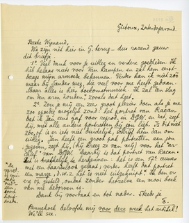 We zijn nèt hier in G. terug - dus razend gauw dit briefje. 1o. Veel dank voor je uitleg en verdere goedheden. Ik hèb helaas niets voor Van Kampen en zal hem eerstdaags mijn armoede bekennen. Verder kan ik niet zóó maar bij Sander weg, die veel voor me heeft gedaan. Maar alles is hier toekomstmuziek. Ik zal ‘een slag om den arm houden’, zooals dat heet.