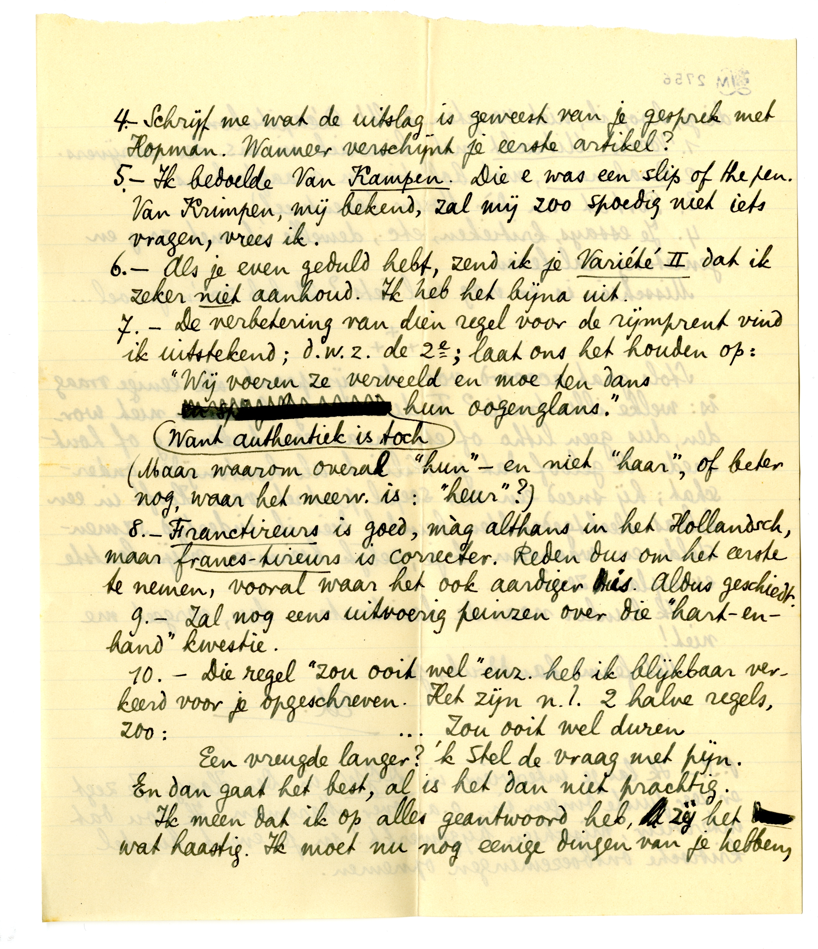 | 1. | Abstract en niet-abstract. Als je Binnendijk tegen mij gaat uitspelen in deze kwestie, is alles precies zooals het wezen moet. Je schijnt te vergeten dat - question de talent mis à part - B. de abstractheid zelve schijnt te zijn, en ik de tot het uiterste doorgedreven ‘persoonlijkheid’. Dus....Jij staat in dezen tusschen B. en mij, vandaar ons: ‘te veel!’ - ‘te weinig!’ - Wil je mijn opinie dus weer, dan is die als volgt: Hypothese, zéér goede titel; zonder aarzelen behouden! (Anticipatie, óók goed; maar ik prefereer het andere.) 2. ‘Maar angst, o de angst’, inplaats van ‘3× angst’, vind ik niet minder of beter, maar even goed; alleen meer met jouw toon in overeenstemming. Maar dit is natuurlijk een geheel persoonlijke indruk. 3. - Nu je vele-mogelijkheden-tot-verbetering-van-den-voorlaatsten-regel (hè!): Het eerste woord moet volgens mij zijn: ‘verstilt’ of ‘versmoort’, liefst zelfs het 2e (voor den klank) - maar van alle mogelijkheden na ‘versmoort’ zou ik juist ‘de smart’ opgeven, en jij neemt het! Neen, geen sm., sm., sm., - laat dat kunstje voor goed in de vele bundels van Van de Woestijne woeden, of vergaan.